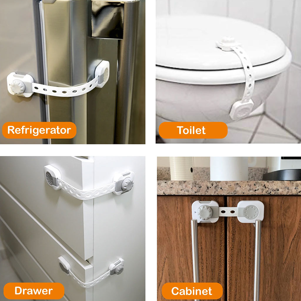 Tonyboo Multipurpose Double Action Child Safety Lock includes 6 cabinet locks with adjustable straps, 6 extra 3M adhesive pads and installation guide. It is specifically designed to prevent access to the dangerous stuff stored in your cabinets, drawers, etc. Snap-in rotating knob mechanism and two side lock release buttons, the lock has a flexible, adjustable strap that works on different types of furniture. It can be attached to straight and corner surfaces. Suitable to secure cabinets, drawers, fridge door, microwave, toilet seat, oven. It is made from non-toxic materials and is gentle to the furniture. No drilling or tools are required. Comes with six extra 3M adhesive pads so you can easily reuse them. The lock will helps to prevent your toddler from the potential harm by accessing unwanted objects stored in your cabinets and drawers. Tonyboo Multipurpose Double Action Child Safety Lock is made from non-toxic materials.