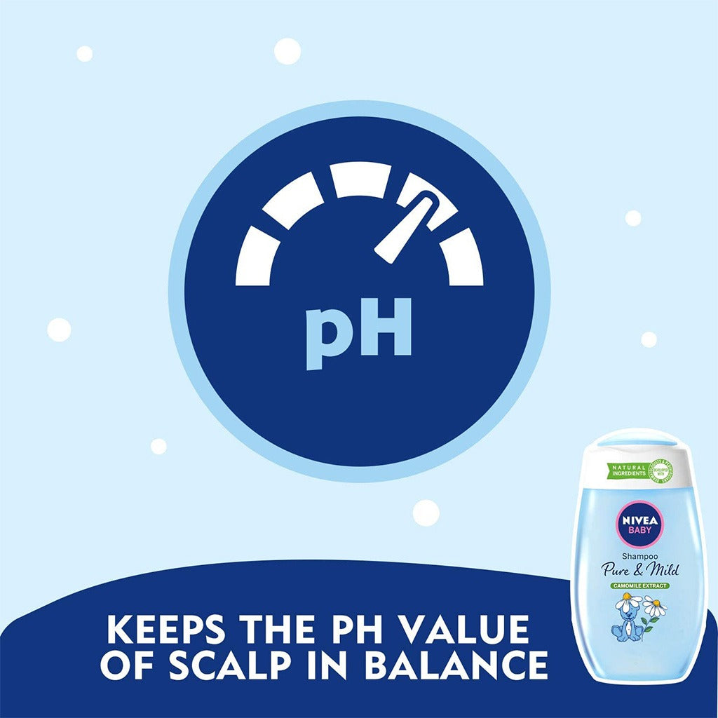Nivea Baby Pure & Mild Camomile Extract Shampoo with Camomile gently soothes and keeps the pH-value of the scalp in balance. It cleanses hair and scalp extra gently leaving hair clean and soft. It is also gentle on baby’s eyes and protects from tears.