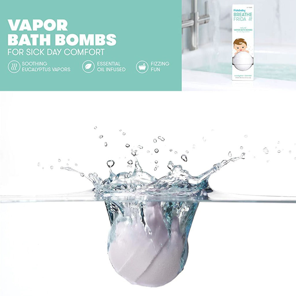 FridaBaby SleepFrida Baby's Natural Vapor Bath Bombs Lavender are vapor bath bombs for bedtime wind down. Kickstart bedtime routine at bath time with Vapor Bath Bombs, made with soothing lavender oils. Like a lullaby for the nose, these lavender Bath Bombs indulge little one in a chill bath sesh and [fingers crossed] a sound night's sleep. It contains lavender oil so it acts as a calming bath vapor for sleepy time. These bath bombs are infused with essential oils to make skin super soft. It helps the kids to relax. Frida is the brand that gets parents. That means you. Frida is not a lifestyle. Far from it. Frida is a solution-based brand. The 411 of parenting. The who-do-I-call-in-the-middle-of-the-night-cause-my-baby-won't-stop-screaming brand.