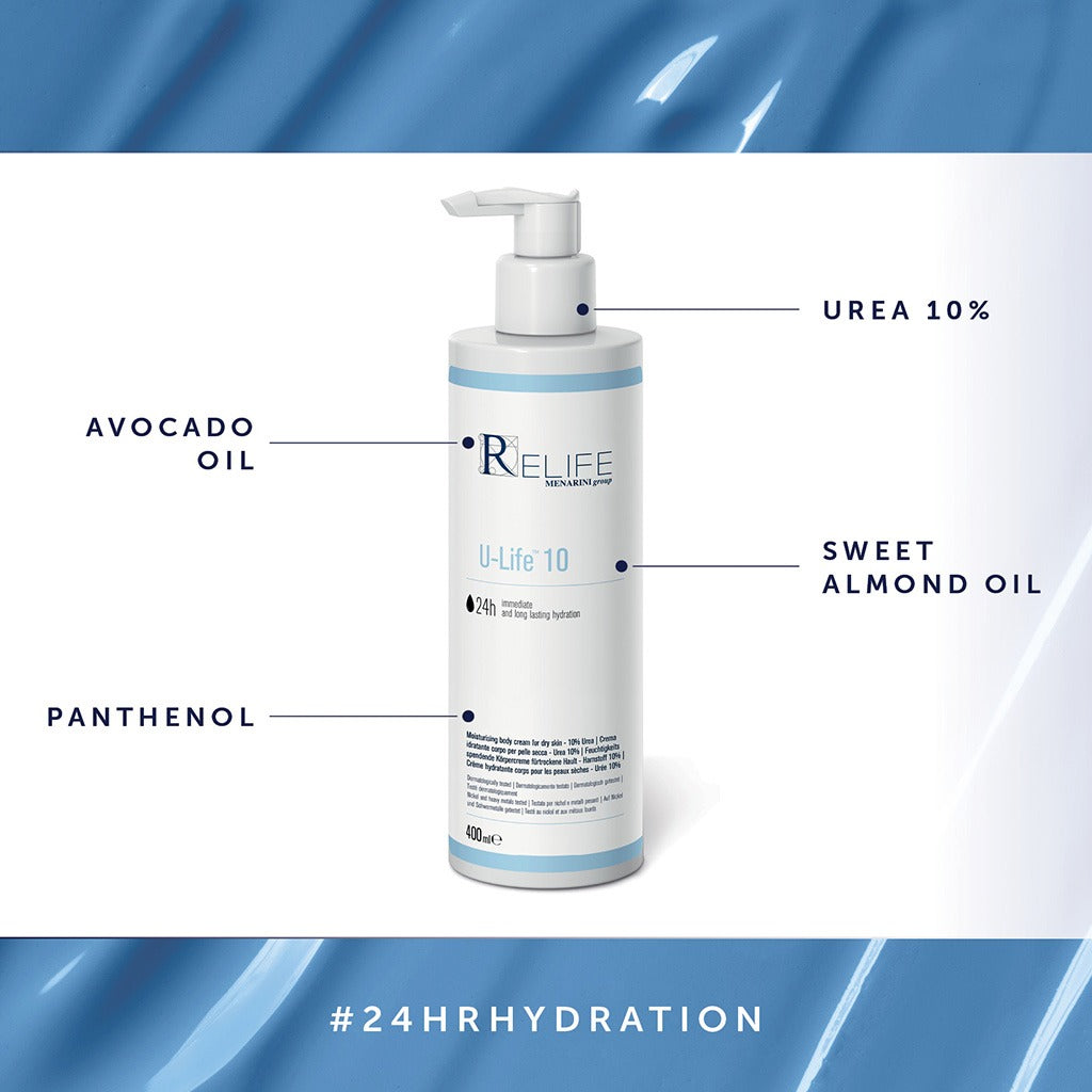 Relife U-Life 10 Body cream is an intensive moisturizer formulated to address dry and dehydrated skin. The formulation of Relife U-Life 10 body cream is incorporated with 10% of urea with additional natural emollient oils such as avocado oil an excellent source of enriching substances for dry, damaged or cracked skin, sweet almond oil with emollient properties and panthenol to maintain skin softness and elasticity. Urea has keratolytic properties that help to remove dead tissues and help to retain more moisture in the skin. U-Life 10 is a product of the U-Life range, a complete line of products with hydrating and keratolytic action for the management of dry, very dry, rough and cracked skin for specific areas of the body. U-Life 10 (10% Urea) Moisturising body cream for dry skin performs a hydrating and stabilizing action, restoring and reconstructing the damaged skin barrier.