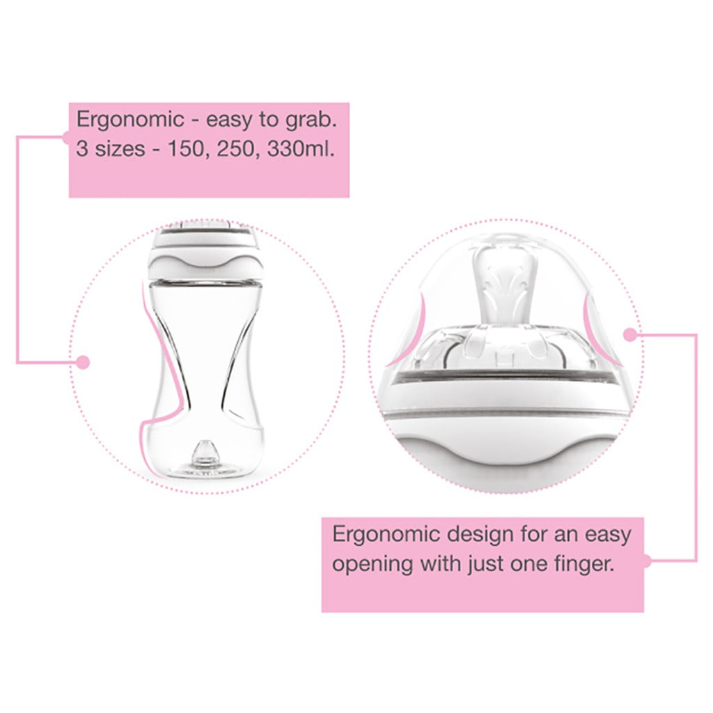 • Nipple ensures comfortable sucking for your baby in all positions