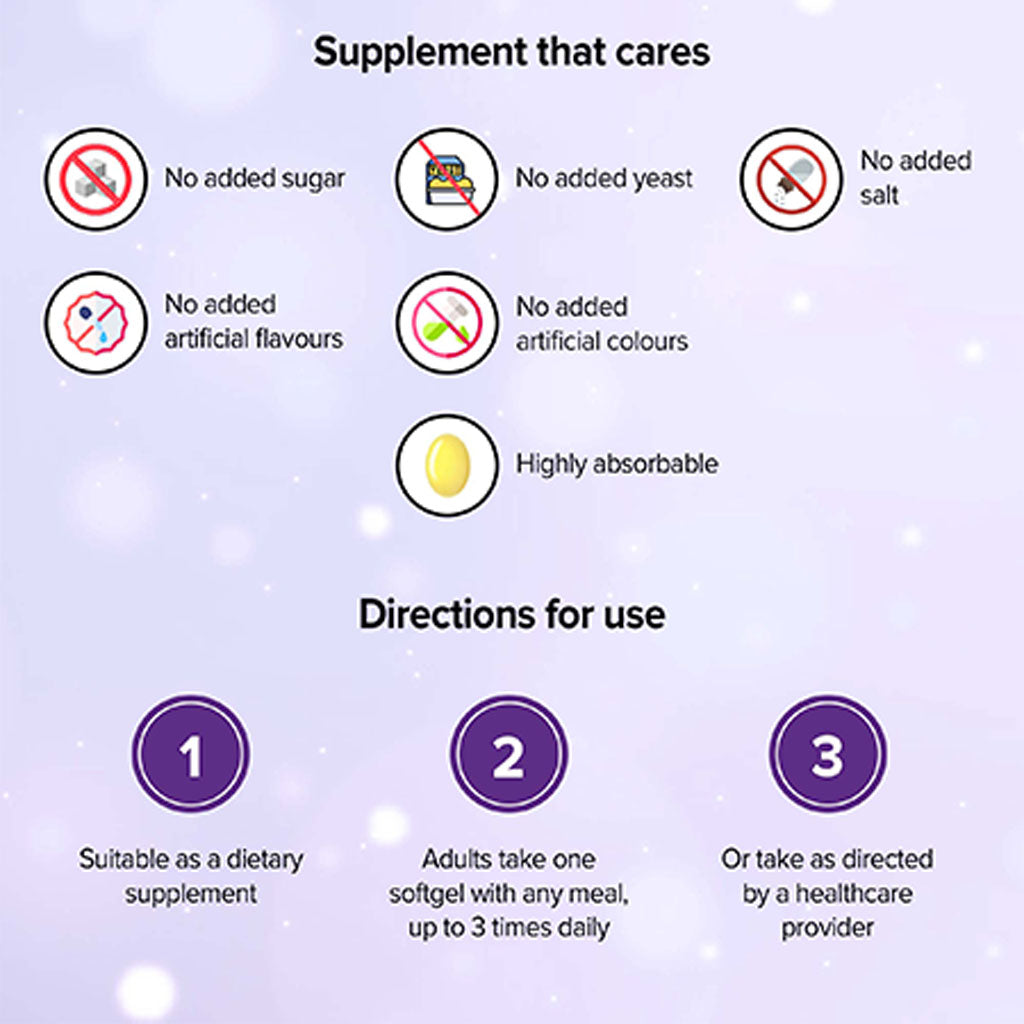 • As a dietary supplement, adults take one (1) softgel with any meal, up to three (3) times daily or as directed by a healthcare provider. Do not exceed recommended dosage. Individual results may vary. Consult a healthcare provider prior to use if pregnant, nursing, taking medications, including blood thinners, have a medical condition or are planning a medical procedure. Stop use and contact a physician if adverse reactions occur. Do not use if product appears to be tampered with or seal is broken. Store in a cool, dry place.