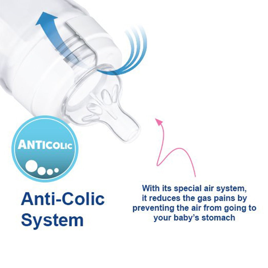 - To use Anti-colic bottles: Sterilize bottles, nipples, caps and rings before using them for the first time. You can boil the bottle and accessories in water for five minutes. Gently place the teat into the baby’s mouth. Keep the bottle in a horizontal position (just slightly tipped). This will allow the milk to flow steadily and help prevent your baby from taking in air. If the teat goes flat while you're feeding, pull gently on the corner of your baby's mouth to release the suction.