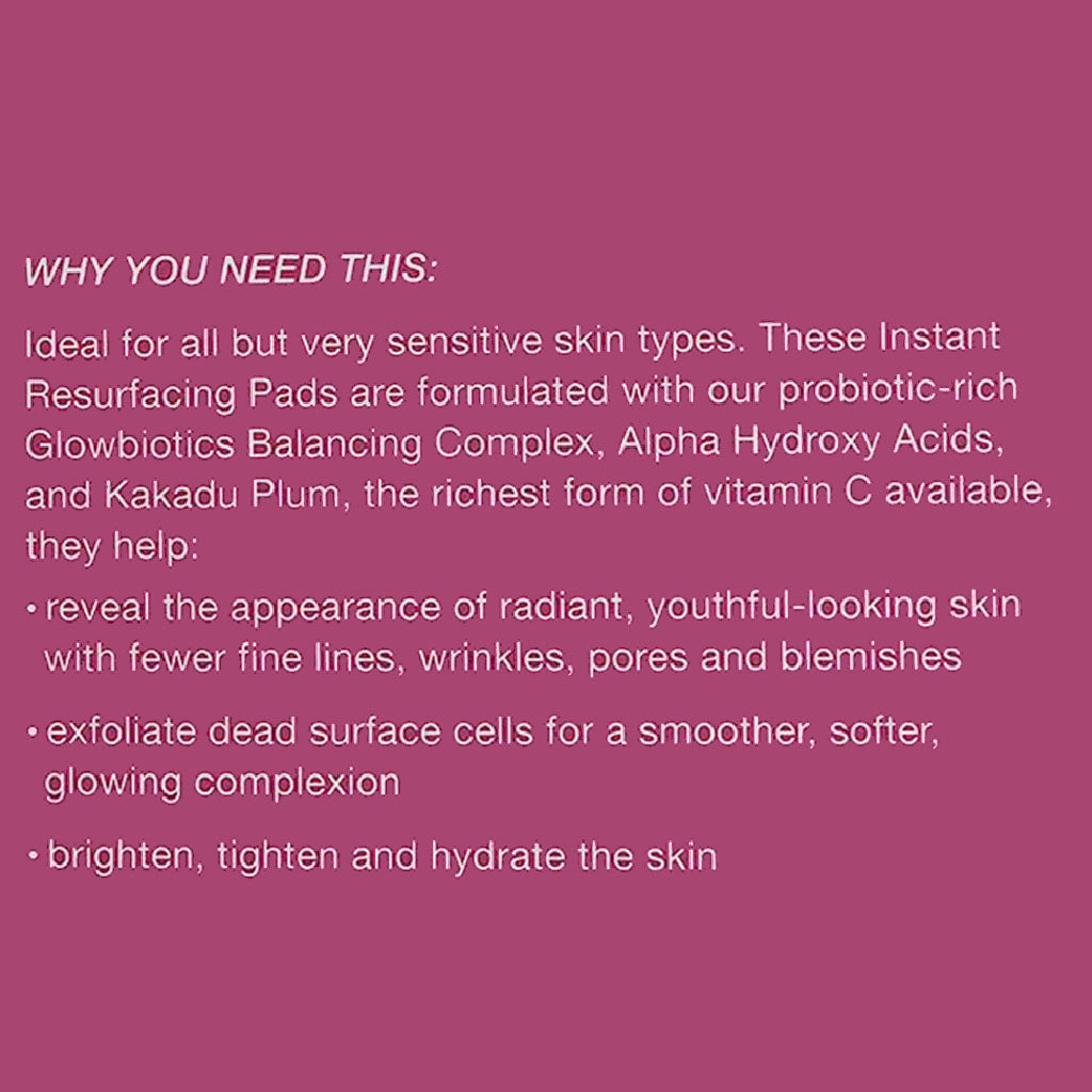 GlowBiotics Probiotic Instant Resurfacing Gentle Facial Exfoliating Pads instantly reveals your skin’s true radiance. The unique probiotic resurfacing pads gently exfoliate away dead surface skin cells to soften fine lines and wrinkles, all while minimizing the appearance of pores and blemishes. This Gentle Facial Exfoliating Pads contains Balancing Complex, Indufence, Ammonium lactate complex and Potassium azeloyl diglycinate. 5% lactic acid, an exfoliating alpha-hydroxy acid that helps promote the shedding of dead skin cells. By gently eliminating the buildup of dead cells, this ingredient helps soften and smooth your skin and improve its overall texture. Balancing Complex is a powerful blend of topical probiotics and antioxidants designed to help balance and restore aging, stressed skin while imparting a tightening effect. SymGlucan (Beta-Glucan) helps reduce visible signs of aging, stimulate fibroblast growth and collagen synthesis while providing immediate comfort and moisture that improves firmness and elasticity of skin as well as protects cells against UV radiation. Superox-C (Terminalia Ferdinandiana Fruit Extract) extracted from the Kakadu Plum, the richest form of vitamin C (super fruit), helps visibly reduce wrinkles, boost luminosity and energize dull looking skin while reducing the appearance of redness and improving overall skin tone. ProRenew (Lactococcus Ferment Lysate) is a probiotic that stimulates the skin’s renewal process, accelerating it and improving its quality. Indufence (Alisma Plantago Aquatica Extract) is rich in purified alisma peptides that activate and optimize the skins natural immune functions similar to that of a probiotic without causing inflammation. Ammonium lactate complex is a skin compatible alpha hydroxy acid that mildly exfoliates and increase cellular lipids for epidermal moisturization. Helps soften fine lines and wrinkles while brightening and conditioning the skin. Potassium azeloyl diglycinate is a new type of azelaic acid derivative proven to enhance skin lightening effects, as well as improvement in exfoliation, redness, hydration and sebum control. The formula is suitable for skin concerns including acne prone, estrogen depletion, excessive dryness, fine lines and wrinkles, hormonal acne, pregnancy, redness and rosacea, sagging skin, and sun damaged. Like a time machine for your skin, you’ll enjoy clearer skin that’s no longer plagued by unwanted pigmentation or age spots.