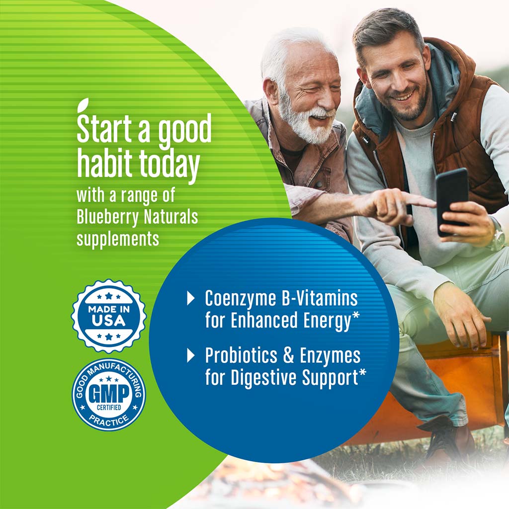 Blueberry Naturals One Daily Men is formulated with 24 essential vitamins & minerals with 10 Organic Whole Fruit & Vegetable blend for daily wellbeing. Blueberry Naturals One Daily Men has been developed to help maintain health in men of all ages. It is ideal for those with a hectic lifestyle and is used by men to help maintain optimal nutrient levels during their active days. Unlike a general multivitamin the nutrient levels have been specifically formulated for men, to provide the recommended daily allowance. A daily multivitamin-multimineral helps provide the body with nutrients commonly missing from the diet. This multivitamin and mineral formula provides a full range of nutrients to support men's health, especially men with sedentary or moderately active lifestyles. Vitamins and minerals are essential nutrients required for the normal chemical processes that occur in the body. Saw Palmetto extract is specific for improved function of the prostate gland. Pumpkin seeds may be beneficial for men with erectile dysfunction as the seeds have many properties that help with prostate function. They also reduce benign prostatic hyperplasia (BPH), a condition in which the prostate becomes enlarged without the presence of cancer and mostly occurs in men over 50. Lycopene has many health benefits for men, like protecting cells, acting as an antioxidant and improving heart health. Blueberry Naturals One Daily Men can be taken by men who don't meet their daily dietary requirements of vitamins and minerals, or for men who would like additional vitamin/mineral support, along with support from additional antioxidants and phytochemicals.