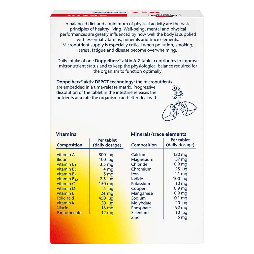 Doppelherz® aktiv A-Z Depot Tablet is a blend of vitamins, minerals and trace-elements released progressively during the day. A balanced diet and a minimum of physical activity are the basic principles of healthy living. Well-being, mental and physical performances are greatly influenced by how well the body is supplied with essential vitamins, minerals and trace elements. Micronutrient supply is especially critical when pollution, smoking, stress, fatigue and disease become overwhelming. Daily intake of one Doppelherz® aktiv A-Z tablet contributes to improved micronutrient status and to keep the physiological balance required for the organism to function optimally. Doppelherz® aktiv Depot Technology: Thanks to the special coating, DEPOT tablets release micronutrients in a timely manner for a better assimilation rate. The micronutrients are embedded in a time-release matrix. Progressive dissolution of the tablet in the intestine releases the nutrients at a rate the organism can better deal with.