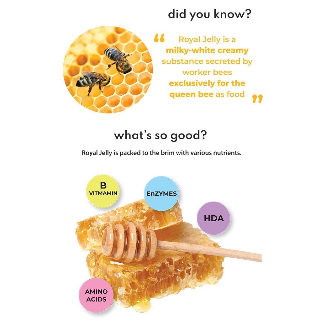 - Freeze-dried concentrate equivalent to1500 mg of fresh Royal Jelly