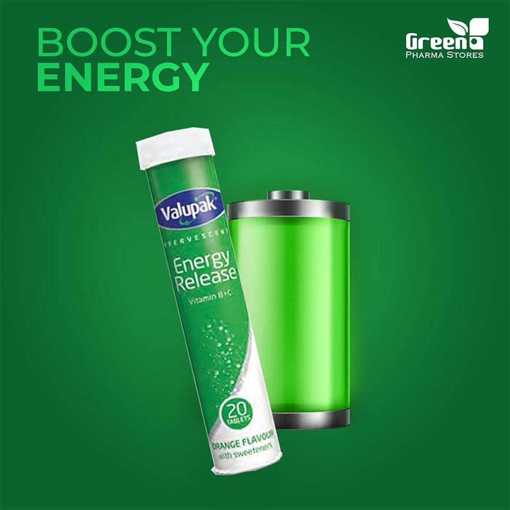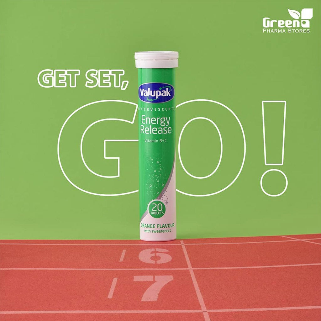 Valupak Energy Release Vitamin B + Vitamin C Effervescent Tablet is orange flavored tablets for energy release to supplement your daily intake with vitamin C, B2, B6 and Vitamin B12. A regular daily intake of vitamin C is required as the body does not store it. Vitamin B2, B6 B12 contributes to normal energy yielding - metabolism. It makes a lovely refreshing orange fizzy drink. B vitamins are important for making sure the body's cells are functioning properly. They help the body to convert food into energy (metabolism), create new blood cells, and maintain healthy skin cells, brain cells, and other body tissues. Vitamin C is an antioxidant that helps to protect your cells against the effects of free radicals — molecules produced when your body breaks down food or is exposed to tobacco smoke and radiation from the sun, X-rays or other sources. Free radicals might play a role in heart disease, cancer and other diseases. Valupak was one of the first brands to be developed and distributed by BR Pharmaceuticals in 1995, providing high quality, low cost vitamins to the consumer. Valupak challenged the industry’s status quo, changing the face of OTC Vitamins & supplements in the UK forever. The brand prides itself on offering value for money products to the consumer.