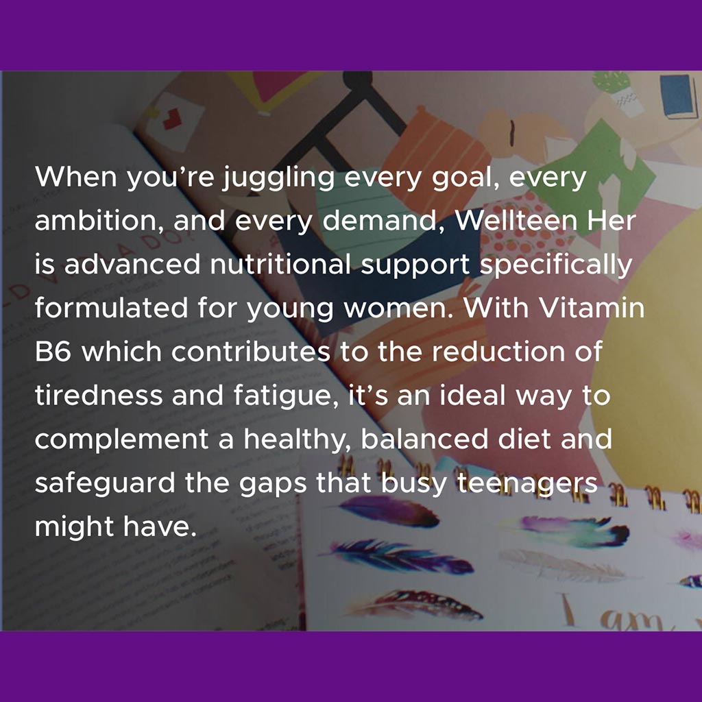 Vitabiotics Wellteen Her Tablet is designed to support the nutritional needs of teenage girls aged 13 to 19 years. During this stage of life, girls often experience significant physical and emotional changes, and their nutritional requirements may differ from those of younger children or adults. An optimum nutritional intake during adolescence and young adulthood can help set the stage for lifelong health. Teenagers need to have sufficient vitamins and minerals to ensure healthy development during growth spurts. Vitabiotics Wellteen Her Tablet with 25 nutrients and co-factors supports the overall health and development of teenage girls. Wellteen Her Tablet may include vitamins such as vitamin C, vitamin D, and B-complex vitamins (B1, B2, B3, B5, B6, B12), as well as minerals like iron, magnesium, and zinc. This tablet often contains additional nutrients such as iodine, biotin, and coenzyme Q10, L-carnitine, grapeseed, and cranberry extracts, which are believed to support various aspects of teenage girls' health, including energy release, immune function, and skin health. Vitamin B6 & iron which contributes to the regulation of hormonal activity & supports normal formation of red blood cells and haemoglobin respectively. Biotin contributes to the maintenance of normal skin, plus selenium and zinc which support to normal hair and nails. Vitamins B6, B12 and vitamin C which contribute to normal energy release and the reduction of tiredness and fatigue. A range of nutrients including zinc, selenium, iron, folic acid, vitamins B6 & B12 and vitamin D contributes to the normal function of the immune system. Wellteen Her with zinc, iron and iodine which maintains normal cognitive function, whilst pantothenic acid contributes to normal mental performance to help support concentration levels when studying. Vitamin D and minerals such as magnesium and zinc which contribute to the maintenance of normal bone health. Vitamin D also helps the body with the absorption and utilization of calcium from the diet.