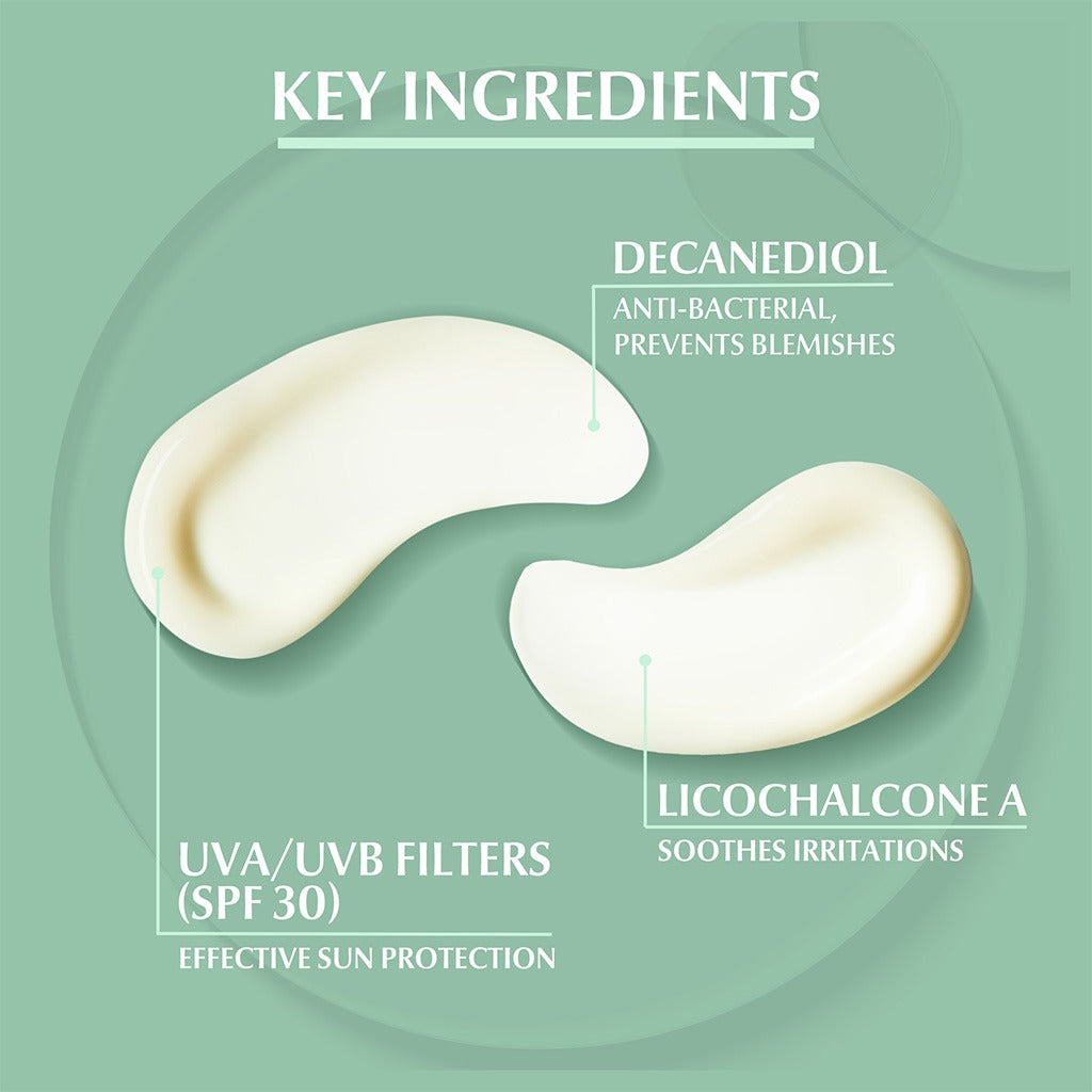 Eucerin Dermo Purifyer Post Blemish Protective Fluid SPF 30 enables you to prevent blemishes and finally beat post-acne marks with 3 key factors. UVA/B filters protect from sun-induced darkening of post-acne marks and prevent their appearance. Antibacterial Decanediol helps to prevent blemishes and Licochalcone A soothes irritations. Anti-shine Sebum Regulating Technology delivers a long-lasting, dry, matt finish. Licochalcone A is a powerful antioxidant, anti-inflammatory and skin-soothing ingredient. When used in skincare products, Licochalcone A works to reduce inflammation and neutralize free radicals that negatively influence skin cells and accelerate the aging process. It helps to protect the deeper epidermal skin layers from sun-induced effects. Decandiol (Decylene Glycol) is a moisturising ingredient with anti-bacterial properties. It is known to fight bacteria such as Cutibacterium acnes (which is involved in the development of acne) and Staphylococcus aureus (which plays an important role in Atopic Dermatitis). Long after the acute acne has faded, up to 50% of people experience post-acne markings (also known as post-inflammatory hyperpigmentation or PIH), which can last up to 5 years. Acne accompanied by PIH is often more emotionally and physically burdensome than acne alone. Now, thanks to Eucerin, victory is visible. Eucerin DermoPurifyer Protective Fluid SPF 30 is the solution for acne-prone skin with post-acne marks. Formulated with SPF to protect marks from darkening due to sun exposure. Eucerin’s DermoPURIFYER is a range of effective dermo cosmetic solutions for impure skin. Its products are designed to address four key factors pertaining impure skin: disrupted skin cell shedding, increased sebum production, increased bacteria proliferation and inflammation of the skin.