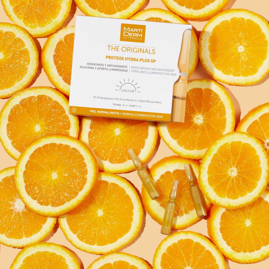 Marti Derm The Originals Proteos Hydra Plus SP is the fluid which is a lightweight serum in individual ampoules that instantly hydrates the skin and makes it brighter over time. This concentrated treatment resorts to 3% Proteoglycans to efficiently hydrate and fight signs of premature aging like wrinkles and loss of firmness. Plant proteoglycans, deeply moisturise the skin, hold water and have firming qualities. Furthermore, the formula also contains 5% pure Vitamin C. In its turn, this ingredient is responsible for boosting an antioxidant action on the skin, preventing, like so, the formation of new wrinkles and sagginess. Finally, the Martiderm The Originals Proteos Hydra Plus SP also provides protection against UVA/UVB radiation. Its fluid texture ensures a quick and easy absorption process and instantly leaves the skin feeling smooth, without any greasy feeling.