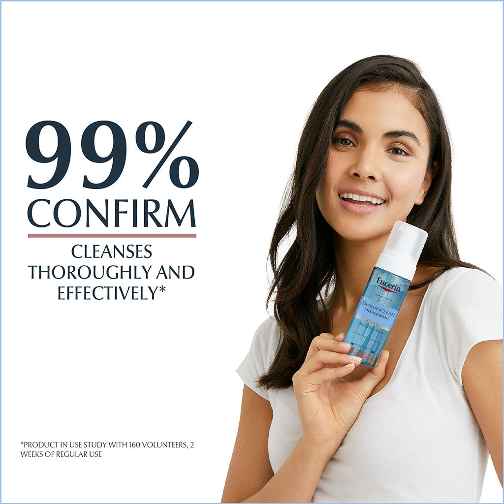 - Cleanse in the morning and evening pump Eucerin Dermato Clean [HYALURON] Micellar Foam into your hand. Apply it to your face, neck and decollete using your fingertips. You can wet your face beforehand if you like but there is no need to rinse off with warm water