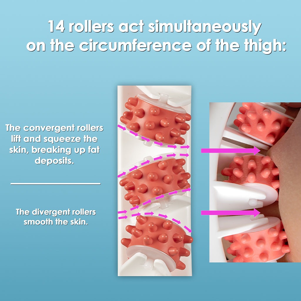 Tesmed Cellulite Anti-Cellulite Manual Massager is a device for the rapid treatment of the appearance of cellulite & is clinically proven to be effective. The design of Tesmed Cellulite promotes an efficient triple action: the rollers lift the skin, which is compressed and then smoothed, helping to stimulate the circulation and favor the elimination of excess liquids. The invention has pairs of converging rollers which lift and tighten the part with a pinching and kneading effect and simultaneously pairs of diverging rollers instead work to stretch the skin. With the action of the converging rollers, the expulsion of excess liquids is favored, and an energetic toning action is exerted, while the diverging rollers then stretch the skin thus also giving a smoothing action. It takes a few minutes a day to apply an energetic firming and smoothing action to your legs. The characteristic shape of Tesmed Cellulite allows you to cover almost the entire area to be treated with a single passage. Thanks to its shape and adjustable opening, treatment can be applied to both legs and to an entire leg, which is surrounded. This means that you can finally treat both the inner and outer thigh simultaneously with a targeted and effective action. Overall, Tesmed Cellulite can assist with the appearance of more toned, smoother, softer, more elastic skin, and noticeably less noticeable blemishes in the treated area.