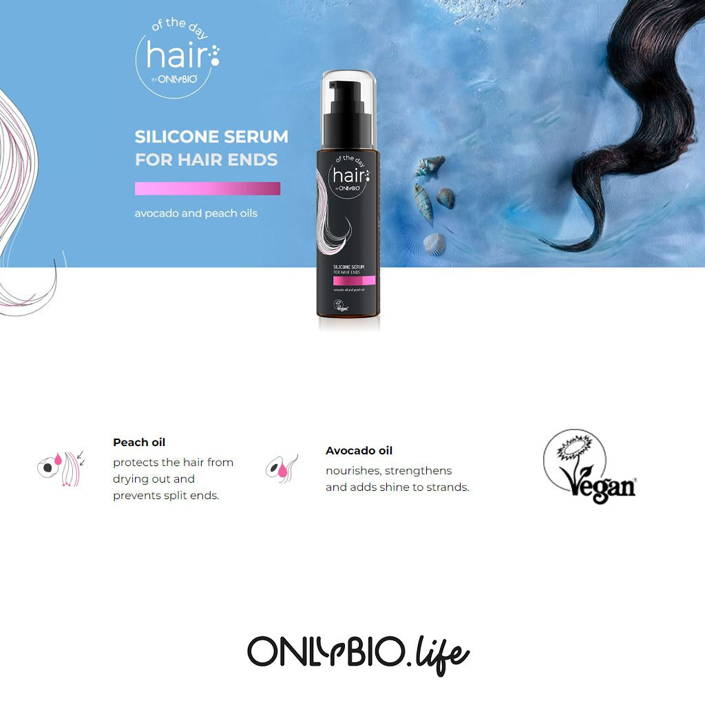 OnlyBio Hair Of The Day Silicon Serum For Hair Ends an innovative product, which provides hair with what is most needed - smoothing, softness, protection against damage, which will allow you to obtain the effect of aesthetic and shiny strands. Don’t be afraid of silicones! Your hair will surely love them. Forget about frizzy hair that can’t be combed out! Each package of the serum contains two active ingredients that will improve the appearance of your hair in the blink of an eye! See how avocado oil perfectly strengthens and nourishes strands, and in addition gives them a healthy glow. Peach oil is a kind of hair barrier which will not allow split ends and overdying! Let’s not forget about the presence of silicones, which enclose moisture in the husk very well, smoothing and protecting against damage. OnlyBio produce unique natural cosmetics, which are characterized by the quality and selection of raw materials, consistency and natural fragrance. Together with dermatologists and professional scientists, OnlyBio work to combine fine formulas with modern research. OnlyBio attach great importance to 100% natural raw materials, 100% environmentally friendly packaging and 100% environmentally safe factories. This is the 3 × 100% philosophy that determines the alignment of OnlyBio. There is no room for compromises. OnlyBio fight for a clean earth because they know there is no planet B.