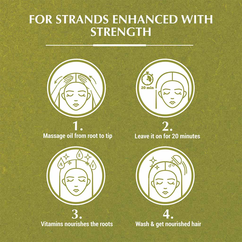 • Apply Dabur Vatika Naturals Olive Enriched Protect And Nourish Hair Oil on your scalp and massage with fingertips using a circular motion. Apply the oil left on your palms to your hair. Cover with a towel or shower cap and leave for 20 minutes. Then rinse thoroughly with a shampoo and condition as normal.