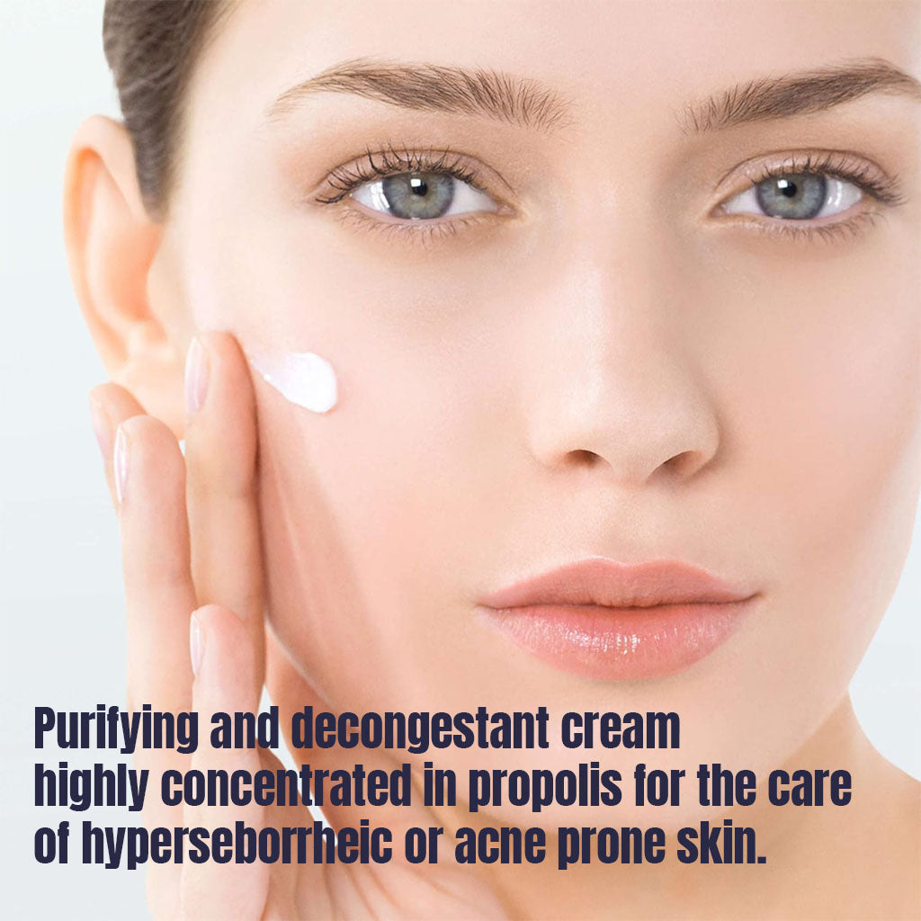 Institut Esthederm Intensive Propolis Cream with light, comfortable and non-greasy texture is a purifying and decongestant cream highly concentrated in propolis for the care of hyper seborrhoeic or acne-prone skin. A mixture of resinous substances worked by bees, propolis has purifying and soothing properties. Institut Esthederm has mastered this synergy of active ingredients to provide a global response to acne-prone skin. This cream rich in Cellular Water offers several actions. Blemishes diminish. The complexion is brighter, the skin is clearer, purified.