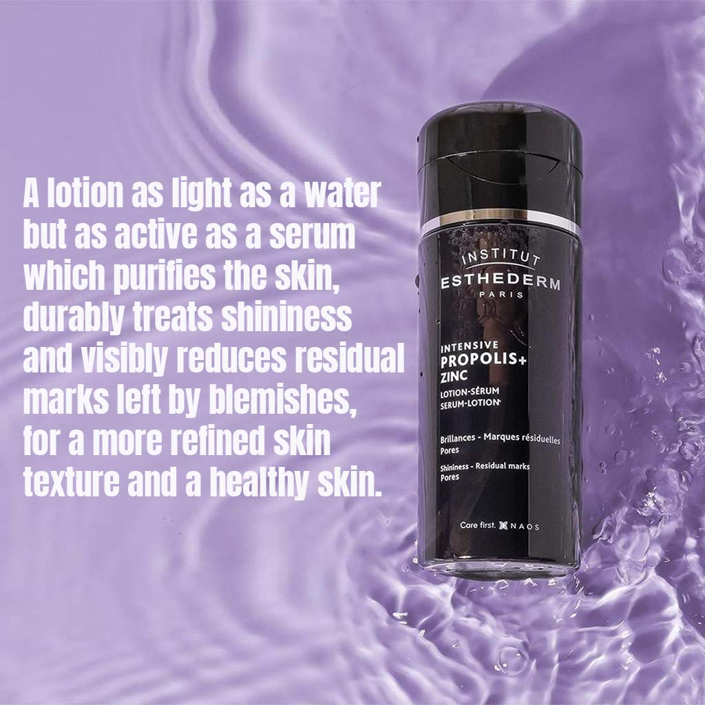 Institute Esthederm Intensive Propolis + Zinc Serum Lotion combines the light texture of water with the potency of a serum. The active ingredients; Zinc glyconate has anti-inflammatory, antibacterial and sebum-regulating effects. It closes open pores, perfectly soothes and mattifies the skin. Zinc in the lotion reduce the oily sheen of the skin and tightening the pores. Totally continual use cause the skin become matte, clean, uniformly toned and the traces of rashes are noticeably reduce. Equally important, the base of the formula is patented cellular water, a booster that enhances the results of your skincare, optimizing the energetic environment of skin cells. Each application grants not only immediate comfort but also a shoot of powerful actives that work to improve the appearance of your skin. As a result, it helps to reduce the appearance of imperfections, mattifies the skin and visibly reduces pores.