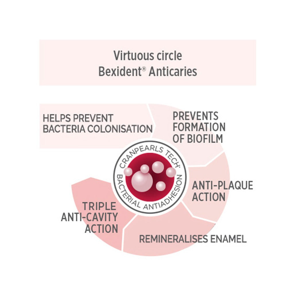 Isdin Bexident Anticaries Mouthwash is the first mouthwash offers a triple anti-cavity action and helps to prevent colonization of bacteria. The formula contains the new Cranpearls Tech, an innovative combination of sodium fluoride and cranberry extract. Cranberry extract is a natural component whose active substance is proanthocyanidin. Several studies have shown it has an anti-adhesive effect, helps to prevent bacteria colonization and maintain the pH of the oral cavity.