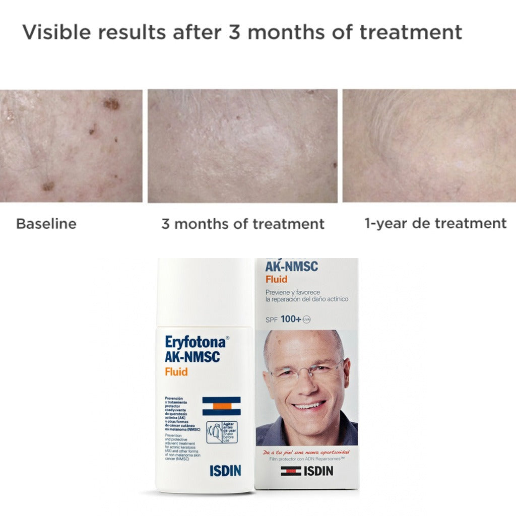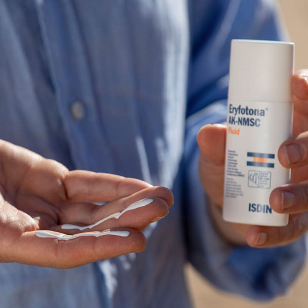Isdin Eryfotona AK-NMSC Sun Fluid SPF100+ for Sun damaged skin not only shields against UV rays but also promotes skin restoration. It has a special composition that makes it the best choice for non-melanoma skin cancer and actinic keratosis prevention or adjunctive therapy. The sun affects cells and damages their DNA. This damage builds up over the years and leads to actinic damage. It can take a less severe form with just wrinkles and dark spots or a more severe form with scaly growths and itching, called actinic keratosis (AK) or non-melanoma skin cancer (NMSC). Healthy individuals are only able to repair the 45% of this damage naturally. Eryfotona contains DNA Repairsomes (photolyase encapsulated in liposomes) which repair another 45% of the damage your body can’t deal with on its own, thus doubling your skin’s ability to repair itself. The bisabolol present in this formula has anti-inflammatory and soothing properties. It helps calm the skin and relieve signs of discomfort such as itching and redness. Panthenol hydrates, softens, and soothes the skin while enhancing the regeneration process. Vitamin E grants antioxidant properties. It protects against free radicals and enhances the photoprotection of the sunscreen filters. It also features potent sunscreen filters (SPF100) that offer great sun protection against UVA and UVB radiation. Additionally, it has anti-inflammatory and calming components that work to soothe the skin and lessen pain indicators. Overall, it coats the skin with a protective layer and is the best option for people who cannot risk sun exposure.