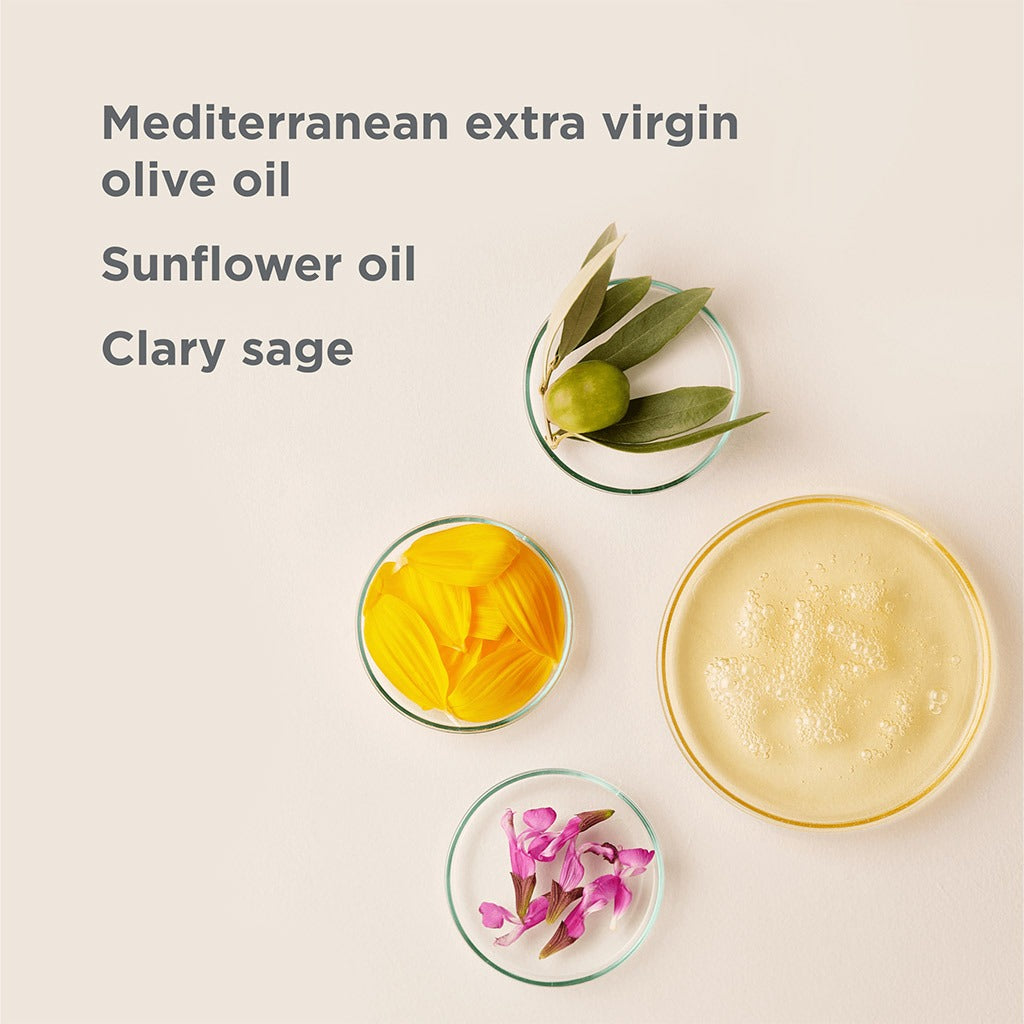 - With Mediterranean extra virgin olive oil, sunflower oil and clary sage