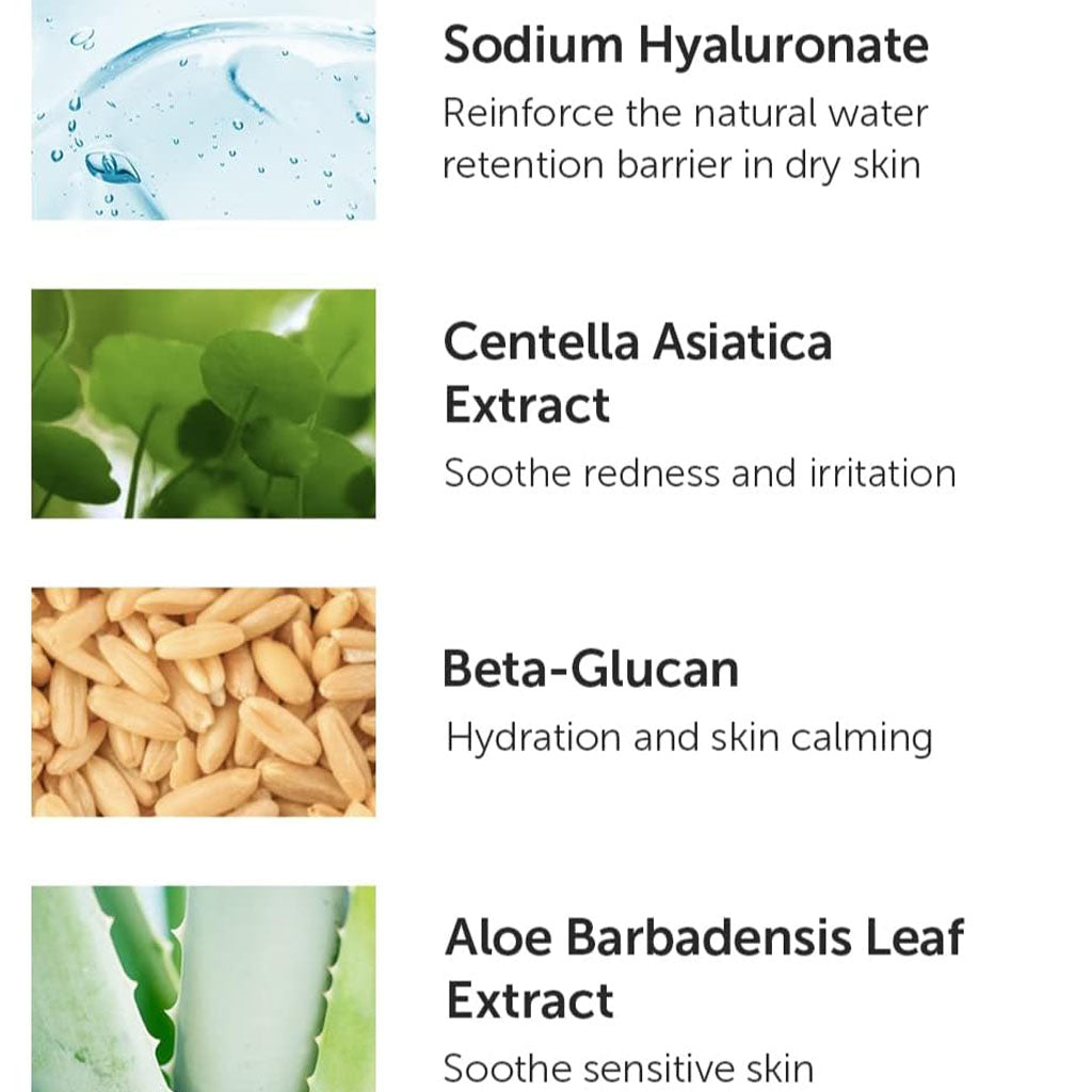 - Enriched with sodium hyaluronate, beta glucan, extracts of aloe vera & centella asiatica extract