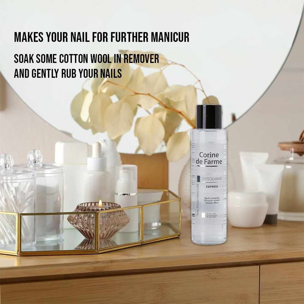 Corine De Farme Dissolvant Express Nail Polish Remover is the solvent that dissolves all types of nail polish, even the most difficult, except permeant polishes. Your nails are immaculate and ready for a manicure that has style. The formula is made with ingredients like acetone, aqua, glycerin and parfum. It is housed in an elegant glass bottle.