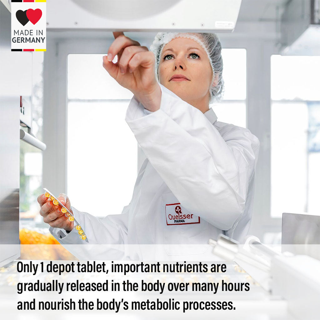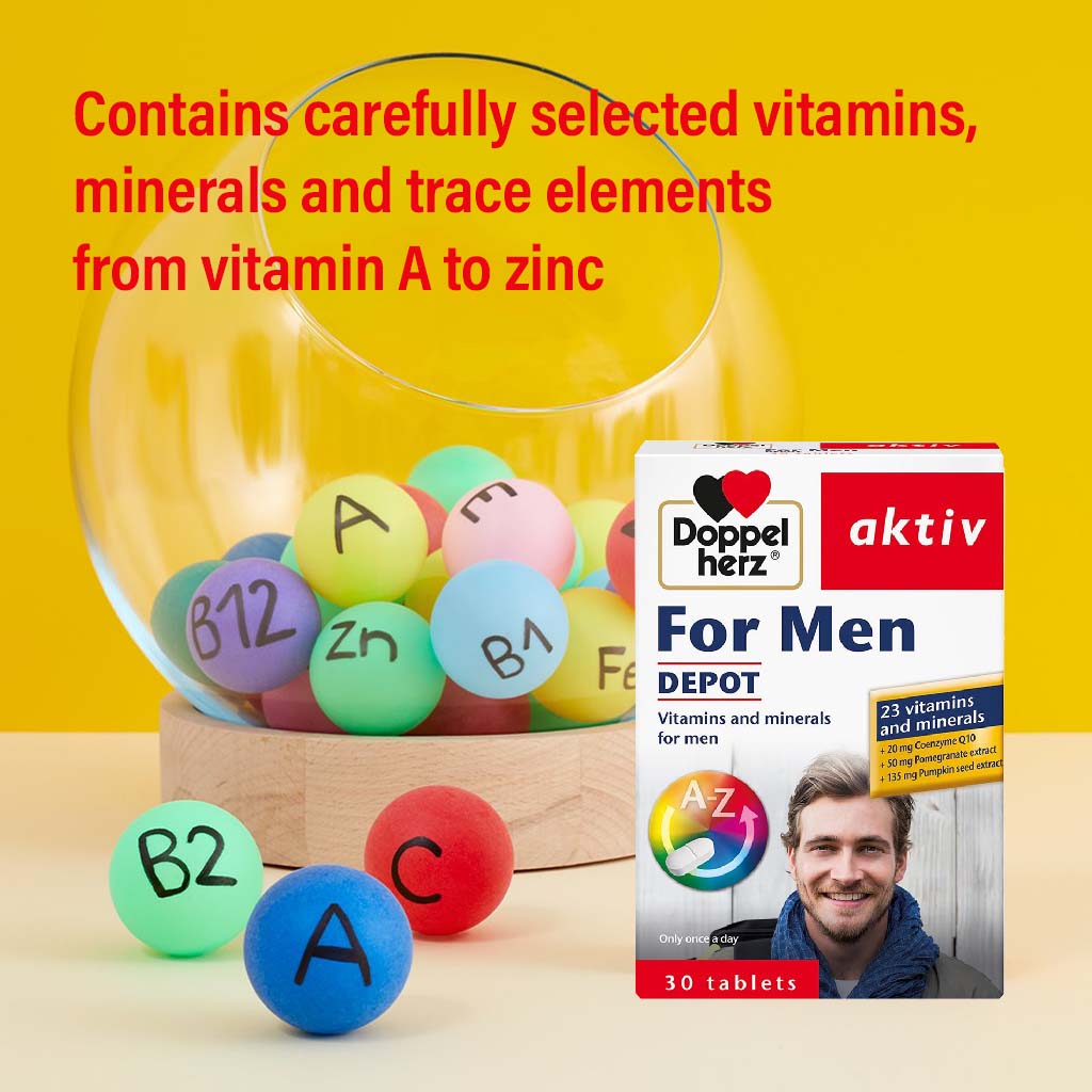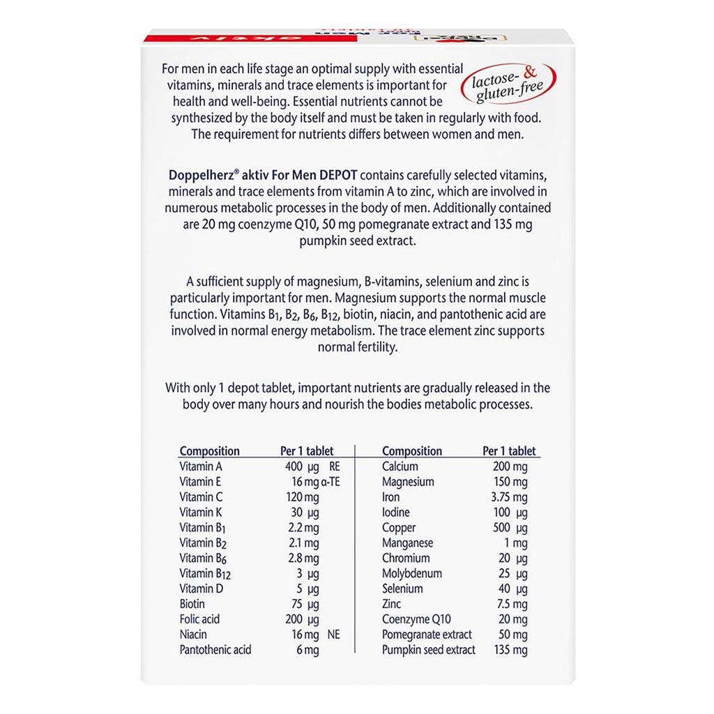Doppelherz® aktiv Vitamin and Mineral Depot Tablets for men contains carefully selected vitamins, minerals and trace elements from vitamin A to zinc, which are involved in numerous metabolic processes in the body of men. Additionally contained are 200 mg coenzyme Q10, 50 mg pomegranate extract and 135 mg pumpkin seed extract. For men in each life stage an optimal supply with essential vitamins, minerals and trace elements is important for health and well-being. Essential nutrients cannot be synthesized by the body itself and must be taken in regularly with food. The requirement for nutrients differs between women and men. A sufficient supply of magnesium, B-vitamins, selenium and zinc is particularly important for men. Magnesium supports the normal muscle function. Vitamins B1, B2, B6, B12, biotin, niacin, and pantothenic acid are involved in normal energy metabolism. The trace element zinc supports normal fertility. With only 1 depot tablet, important nutrients are gradually released in the body over many hours and nourish the bodies metabolic processes.