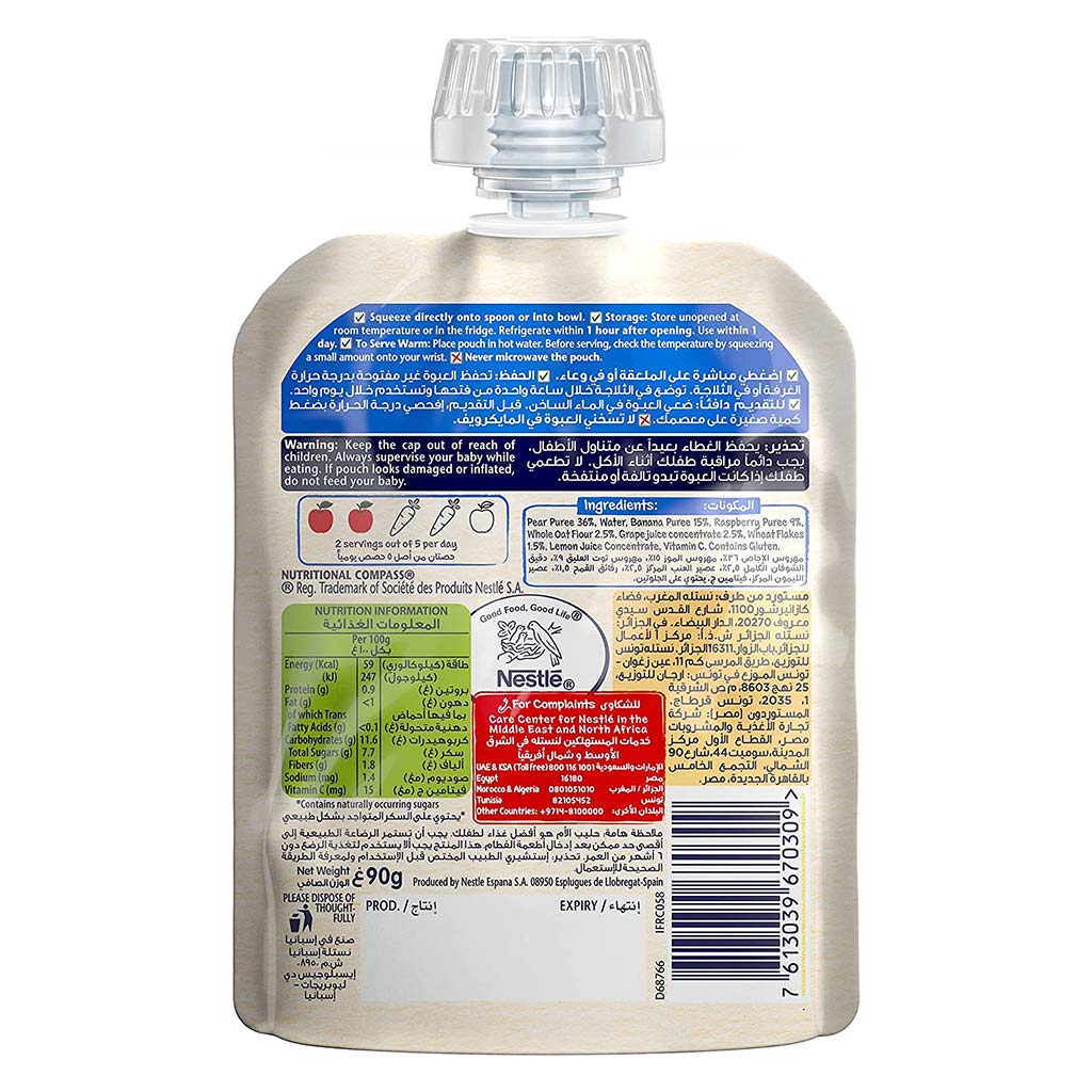 NESTLE® CERELAC® 6+ Months Raspberry, Pear, Banana & Oats Puree Pouch are made with carefully selected 100% natural fruits vegetable. When introducing solids to baby, this convenient, ready to serve pouch with serving spout will allow more control, meaning less waste and less mess, ideal when on the go. Made with carefully selected 100% natural fruits, quality tested, then taste tested by the little ones themselves, to give you confidence in your decision. Contains vitamin C which helps support healthy brain and cognitive development. So, when introducing solids to your baby, this convenient, ready to serve pouch with serving spout will allow more control, meaning less waste and less mess, ideal when on the go! Each one of the purees passes over 100 NESTLE® quality checks, they contain no added sugar or salt, and no artificial colours or flavours.
