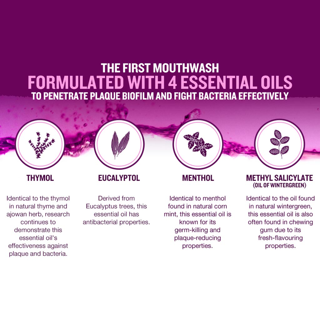Listerine Total Care Zero 6-in-1 Mouthwash is an alcohol free mouthwash proven to reduce plaque and maintains healthy gums. Contains Fluoride for cavity protection and provides lasting fresh breath confidence. Listerine products all contain the same combination of essential oils, which have been clinically proven to reduce plaque development by up to 56%. One of the key ingredient, Thymol is derived from the Eucalyptus trees, this essential oil has antibacterial properties. Eucalyptol - similar to the thymol found in natural thyme and eucalyptus, research continues to demonstrate the effectiveness of this essential oil against plaque and bacteria. Menthol - the essential oil is similar to the menthol found in natural peppermint, and is known for its germ-killing and plaque-reducing properties. Methyl Salicylate (Oil of Wintergreen) is identical to the oil found in natural wintergreen, this essential oil is often found in chewing gum due to its fresh flavor characteristics. Listerine is the next step to ensuring a healthier mouth. Since 1895, it has changed oral health care and has become the #1 leader in mouthwash. The Listerine mouthwash range is proven to reduce plaque and kill germs. The products offer a list of benefits including but not limited to helping fight bad breath causing germs, keeping teeth naturally white and caring for your gums and strengthening teeth.