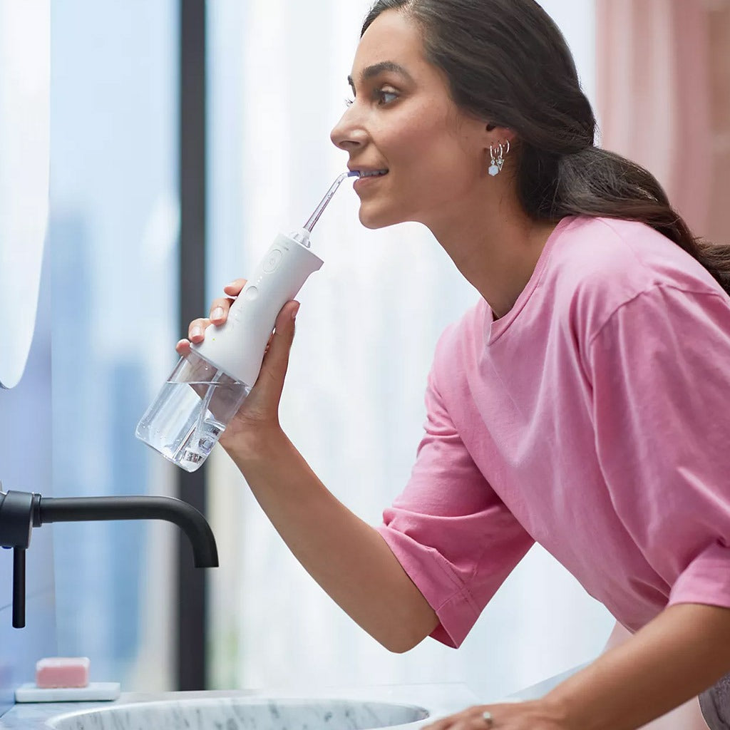 Philips Sonicare Cordless Power Flosser 3000, White HX3806/31 is the cordless, compact, ergonomic oral irrigator which offers a convenient solution for everyday flossing. It featured with a standard single-stream tip which boosts pressure for spot cleaning and removes food debris when you need it. It has a unique X-shaped quad stream tip that separates flow into 4 water jets, which cover more area between teeth and along the gum line. Pulse Wave technology offers gentle pulses of water that keeps you going and guide from tooth to tooth in deep clean mode - so you get it right every time. 360 nozzle rotation for easy access those hard-to-reach areas with a nozzle that rotates 360 degrees, so that you can use the device in any orientation. The 250ml reservoir capacity, holds enough water for a recommended 60-second clean. Simply twist and remove or use the side-fill door for easy refilling. The Philips Sonicare HX3806/31 Cordless Power Flosser features 2 flossing modes & 3 intensities; clean mode delivers continuous flow for effective everyday cleaning. Deep Clean pulses for more thorough cleaning. You can adjust the intensity level adapts for comfort. It also has a multi-voltage charger. Convenient charging with a USB-C cable uses the same connection as most mobile phone or tablet. It helps to leave your mouth feeling fresh and clean without the hassle of string flossing.