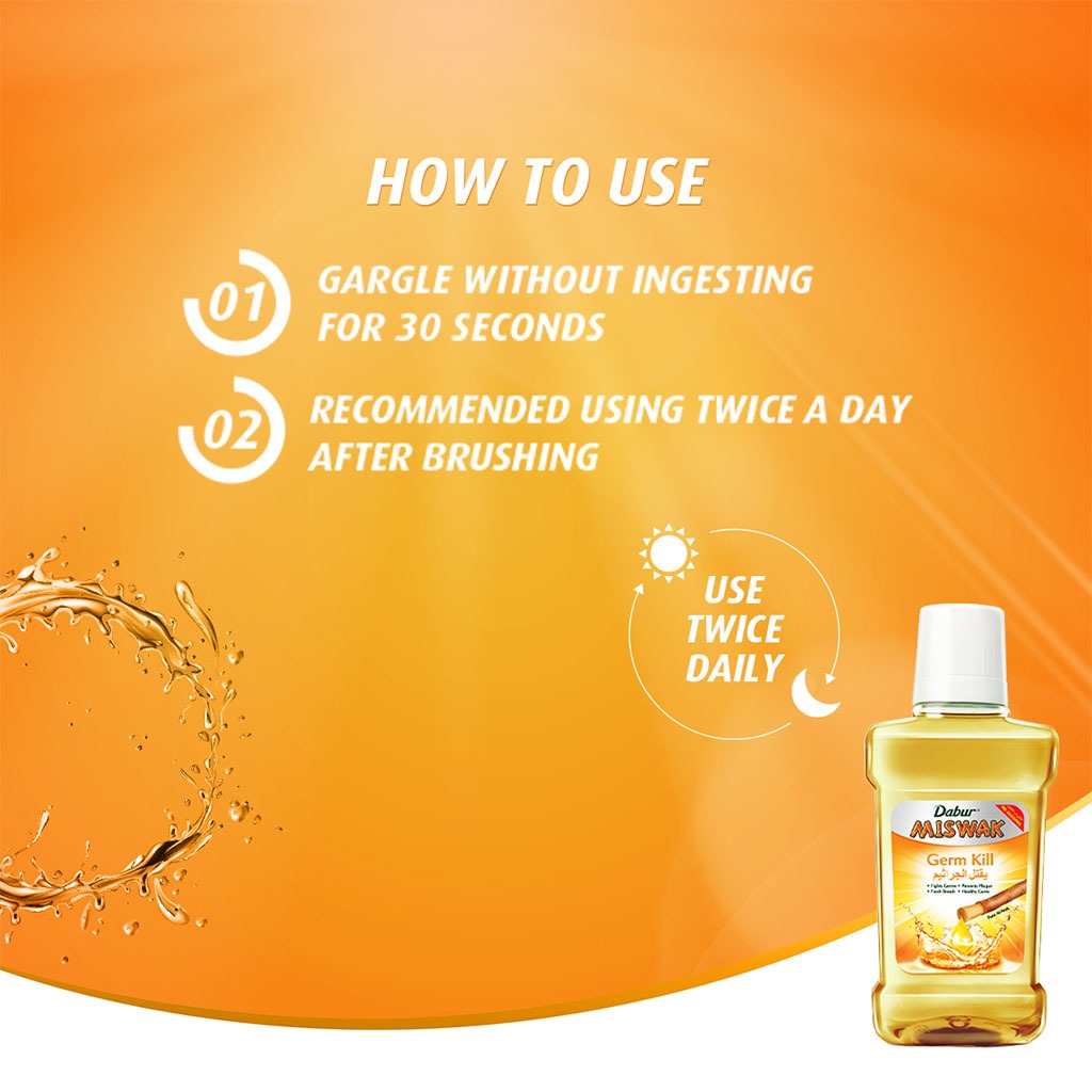 Dabur Miswak Germ Kill Mouthwash is scientifically formulated with Mint and Al Arak extract that gives extra fresh breath and better oral health. Dabur Miswak Mouthwash does not contain alcohol. The goodness of Al Anak helps reduce tooth decay plaque thereby ensuring healthy gums, Mint gives you a long lasting extra fresh breath