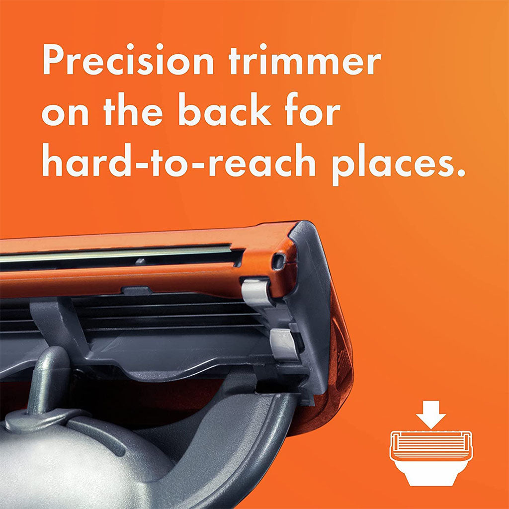 Gillette Fusion5 Razor Blade Refills offers outstanding shaving performance, even on sensitive skin, to help you look your very best. It gives you the awesome feeling of a five-blade shave at an affordable price. The Fusion5 has five anti-friction blades that last up to 20 shaves per blade refill and without ever sacrificing comfort. Gillette Fusion5 Razor Blades feature thinner, finer edges with advanced low-resistance coating to cut effortlessly through hair with less tug and pull. The Gillette Fusion5 razor features ultra-soft skin guards consisting of 15 thinner, more flexible Microfins. These Microfins precede the blades and smooth out the skin before the first blade cuts the first hair. The soft Microfins before the blades thus stretch and smooth skin to prepare your skin for a smooth shave, while the Lubrastrip makes sure the blades glide across your skin easily. So you get a close, comfortable shave. Lubrastrip delivers water soluble lubricants to the skin for incredible comfort. Edging blade on the backside is for hard-to-reach places and styling facial hair. Plus, you can use it to shape your facial hair. Engineered with antifriction blades for up to a month of shaving per blade. With Gillette's Fusion5 razor and blade refills, you can get a great shave at a great price.