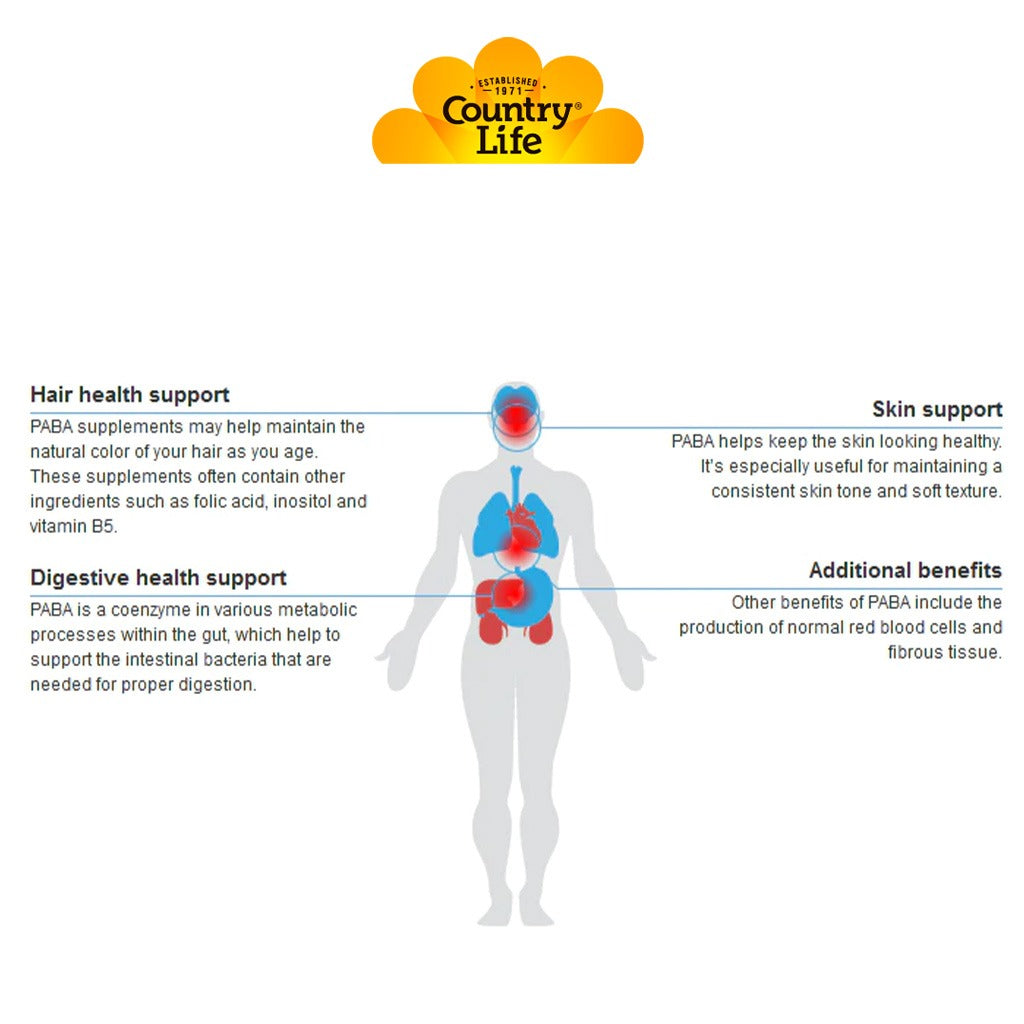 PABA is a precursor of folic acid and may be used by our gut microbiota to produce folic acid. PABA, or para-aminobenzoic acid, is generally classified with the B-vitamin family, although it is not itself a vitamin. Its best known role is as a precursor for folic acid production. Folic acid is important in cell division and the healthy development and structure of red blood cells. Wellness goals differ from person to person. That's why Country Life supplements focus on commonly deficient micronutrients that, when combined, can meet nearly any body's needs. Being healthy is essential to being happy and Country Life believe that good health is an important part of treating yourself well. With a 40 year plus heritage of providing wellness, Country Life's high quality products have been helping you stay happy and healthy since 1971.