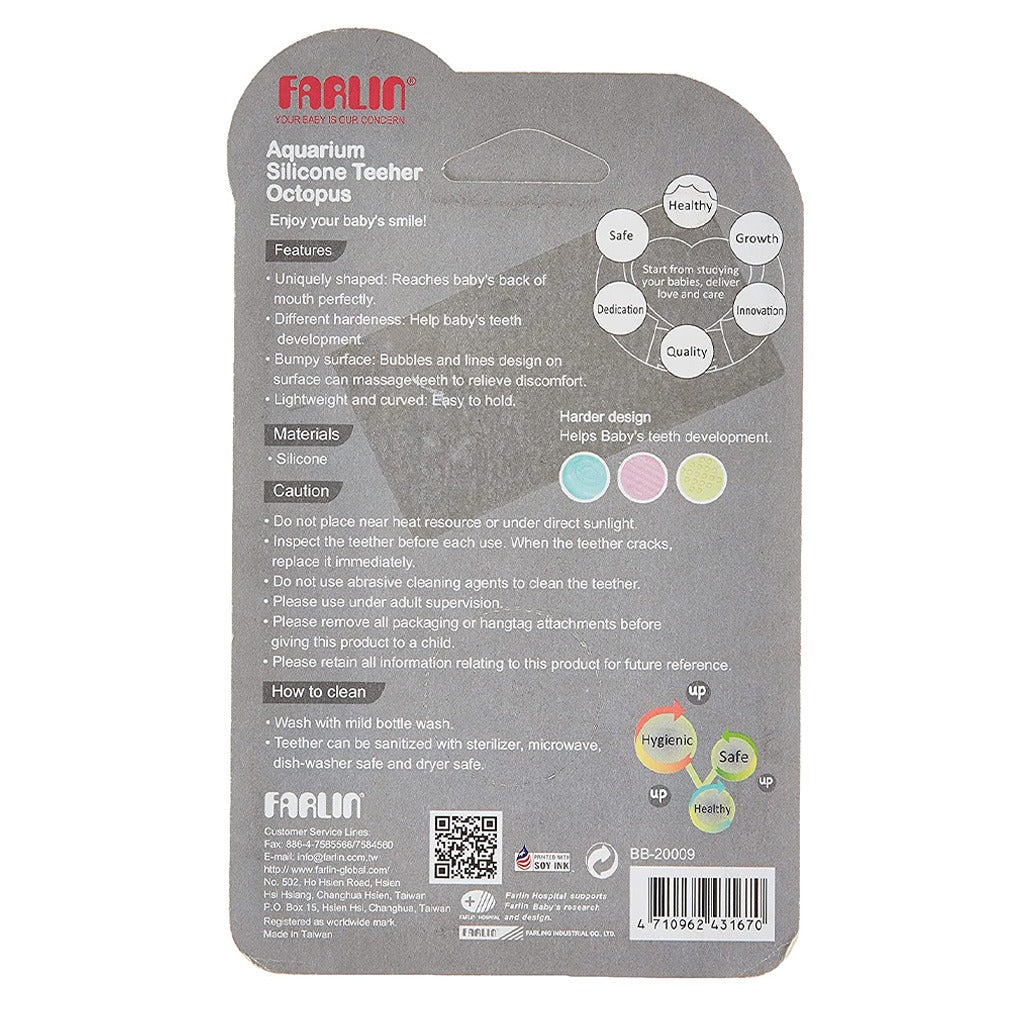 - Disinfect the Farlin Aquarium Octopus Silicone Teether and place it in your babies hand ( if they have learnt how to grasp things). You can also place the teether in the babies mouth.