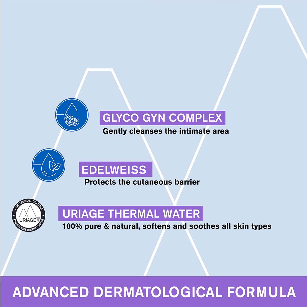 Uriage Gyn-Phy refreshing intimate cleansing gel is a feminine wash that gently cleanses and maintains the natural balance of the intimate area. It quickly relieves and calms sensations of discomfort, and instantly restores natural balance to the intimate areas. It is formulated with GLYCO-GYN complex, piroctone olamine and Uriage thermal water. The cleansing GLYCO-GYN complex (glyco-esters and glyco-flavonoids of Edelweiss) delivers a gentle cleansing action without causing dryness. Edelweiss protects the cutaneous barrier and piroctone olamine provides anti-bacterial action and helps to kill odour causing microbes and maintains intimate area hygiene. Uriage thermal water soothes and softens the skin providing a calm sensation of comfort instantly. The alkaline pH combined with piroctone olamine helps restore the natural balance of the intimate flora. Uriage Gyn-Phy intimate hygiene soothing & was is hypoallergenic with physiological pH of 5.5 and tested under gynecological supervision. It has a pleasant floral fragrance. This product is specifically formulated for the daily hygiene of the external intimate mucous membranes.