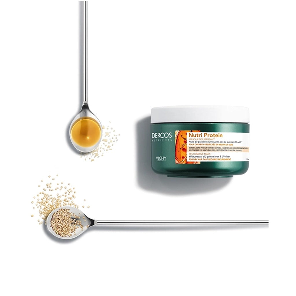 - Take a generous amount of Vichy Dercos Nutrients Protein Hair Mask For Silky Hair and apply generously to the lengths of clean, washed hair, massage in and leave for few minutes and then rinse carefully. In case of contact with eyes, rinse them immediately and thoroughly. Use several times a week to restore moisture and repair your damaged hair.