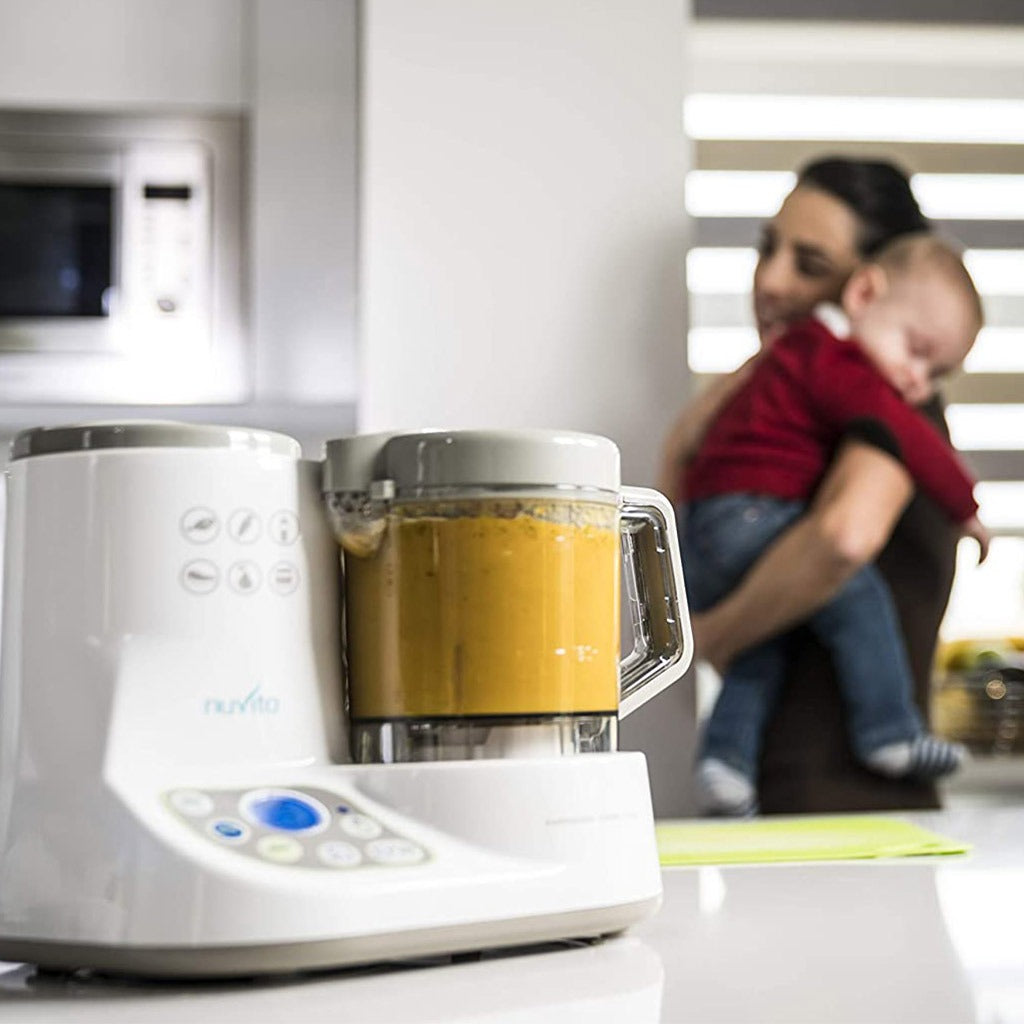 Nuvita Pappasana 6-In-1 Vapor Combo Food processor and bottle warmer is the 6 functions in one device, with the special "cook & blend" button, mum saves time: all she has to do is pour in the ingredients and in just a few minutes baby's meal is ready, cooked to perfection and creamy to the right consistency. It has the digital display, on that there are 6 functions to activate each function individually; it can therefore be possible to just blend, just cook, just heat, etc.... setting the desired time. The digital display makes it easy to choose each individual action by simply holding down the icon or to automatically set times from 5 to 30 minutes in the case of cooking. It steams, chops, blends, homogenizes, defrosts, heats bottles and jars and also sterilizes the accessories in a natural way with the power of steam. The special shape of the steel blades is designed to homogenize the ingredients without forming air bubbles: this prevents your baby from the colic symptoms. For the weaning period it is useful for chopping, blending, homogenizing and cooking fruit, vegetables, meat and fish. The glass has a capacity of 500 ml; water tank is made of ceramic, easy to clean to remove any limescale deposits. Nuvita Pappasana is a useful accessory to be included in the birth list and is a very useful gift idea for parents who are able to use it from the first months of life up to the weaning age of the baby.
