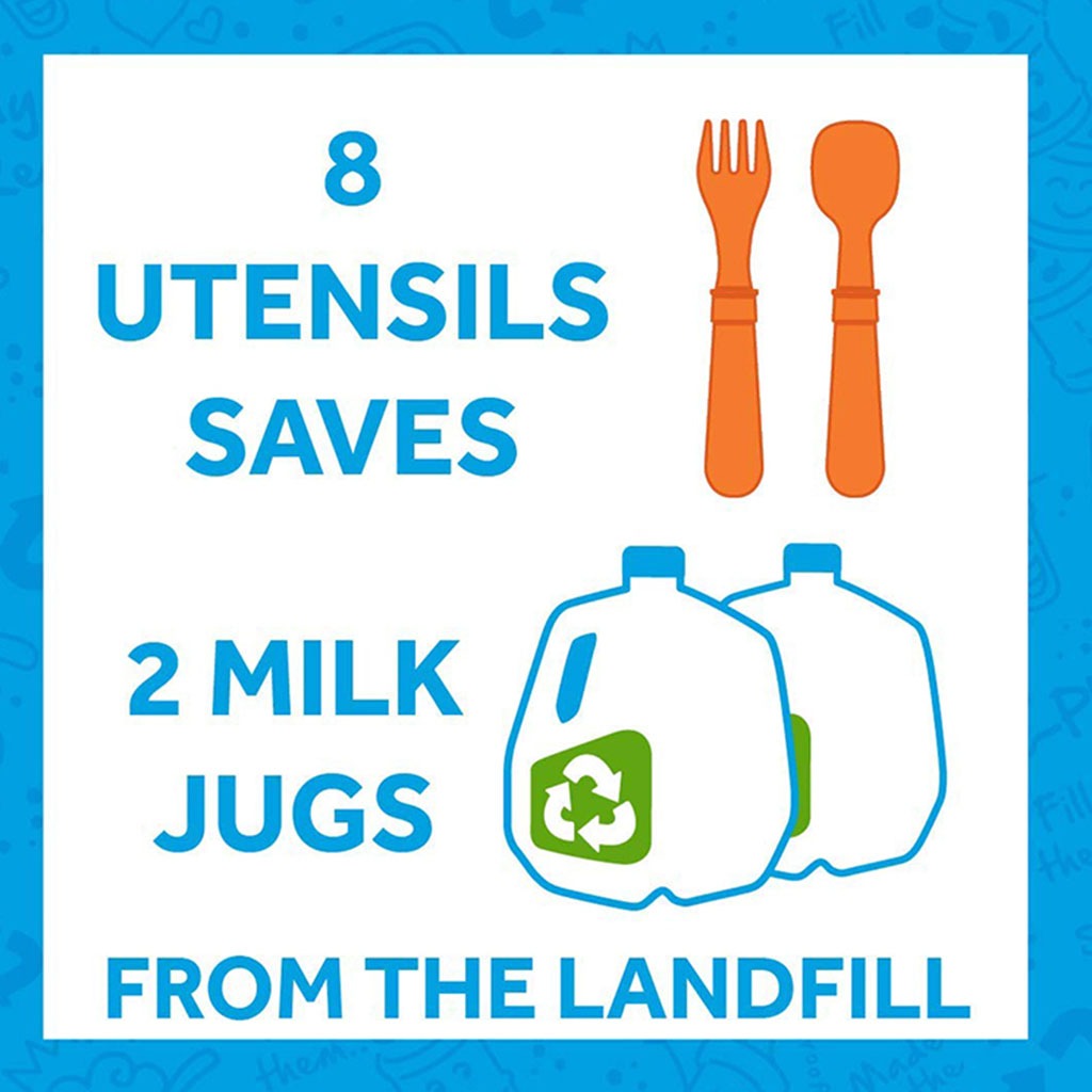 Re Play Toddler Feeding Utensil Set Of Spoon and Fork are the perfect pick for kids on the go!. Re-Play Spoons have deep scoops to help your little ones learn proper spoon use early, while Re-Play Forks have durable rounded tips for your child's safety. Re-Play spoons and forks are sized just right for your toddler, with thick handles that are easy for the child to grip making independent feeding that much easier to learn! Re Play baby utensils fits safe even in the hands of the most inexperienced. It might be messier, but it can help improve their hand-eye coordination and motor skills. Mix and Match your Re-Play utensils with a variety of Re-Play's other tableware items to create a vibrant and colorful tableware set! All Re-Play products are made from recycled sustainable HDPE (milk jugs) recycled plastic. Not only are they better for your child, they are better for your environment! Re-Play products are 100% non-toxic: BPA, phthalate, PVC and melamine FREE. To further protect our planet, these environmentally friendly utensils are also 100% recyclable at their end of use! Re-Play makes safe, sustainable recycled infant and toddler dishware. Re-Play has become known by mothers around the world for infant and toddler dishware that is affordable, durable, and sustainable. Children's tableware from Re-Play comes in a wide color palette, manufactured from recycled, FDA-approved, food-safe plastic.