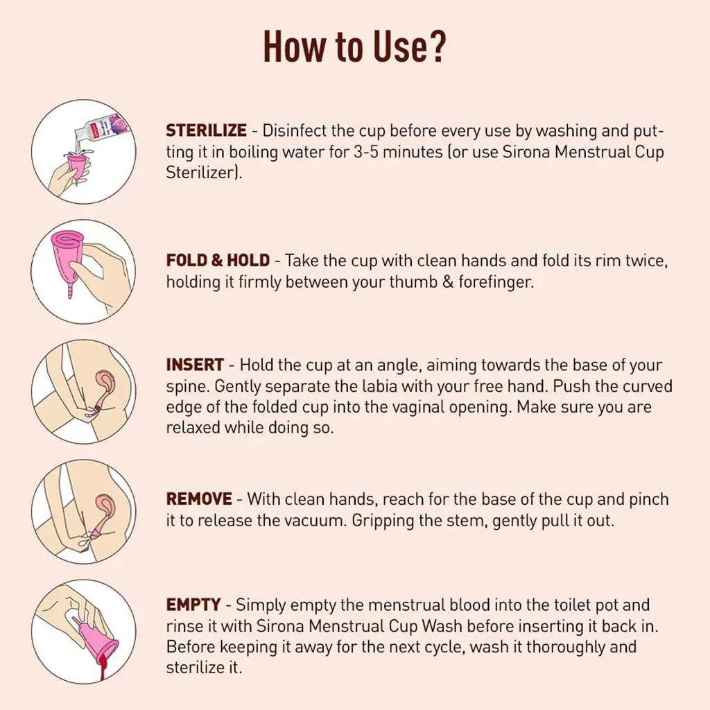 - Empty the cup, wash it with Sirona Menstrual Cup Wash and reinsert again. Sterilize and dry the cup before storing it for next cycle