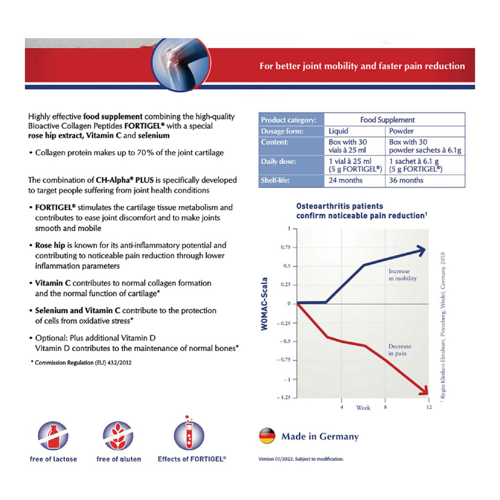 CH-Alpha Plus Drinkable Collagen Peptide Vial is the perfect, natural, and effective way to protect and regenerate joint cartilage for an active lifestyle at every age. It is the dietary supplement that supports joint health and mobility. CH-Alpha Plus contains bioactive collagen peptides (cow sourced collagen), a special assortment of proteins and amino acids that serve as the foundation for healthy joints. Scientific research supports the use of the bioactive collagen peptide formula to rebuild cartilage without unfavorable medication interactions or side effects. Collagen hydrolysate (CH), hyaluronic acid, selenium, vitamin C, and rosehip extract are the key components of CH-Alpha PLUS. Bioactive collagen peptides/collagen hydrolysate, that is backed by a patent, has a unique collection of peptides and amino acids, which are necessary for joint health. CH-Alpha Plus is a natural product with an amino acid composition that is nearly identical to the collagen found in the extracellular matrix of the joints in the body. Collagen hydrolysate is proven to stimulate chondrocyte cartilage cells, which are responsible for the maintenance of cartilage health. Studies have shown that the collagen hydrolysate increases the concentration of collagen and proteoglycans through the effect it has on chondrocyte cells. These natural, safe supplements have been proved to have positive effects in clinical investigations, particularly the collagen hydrolysate, which has been found to help enhance the thickness and volume of joint cartilage. CH-Alpha PLUS with the added power of five ingredients helping you with chronic joint symptoms. It also contains the active ingredient FORTIGEL, Developed by GELITA, FORTIGEL is an innovative ingredient for the regeneration of joint cartilage. Collagenous protein makes up nearly 70% of cartilage mass. Optimized specific collagen peptides of FORTIGEL have been proven to activate the growth of new cartilage by stimulating cells helping to ease joint discomfort and make the joints smooth and mobile. By keeping people physically active and mobile, FORTIGEL can improve quality of life. Rose hip is known for its anti-inflammatory potential and contributing to noticeable pain reduction through lower inflammation parameters. Vitamin C contributes to normal collagen formation and the normal function of cartilage. Together with selenium, vitamin C contribute to the protection of cells from oxidative stress. Finally, the additional vitamin D contributes to the maintenance of normal bones. It comes in a convenient one-month supply of drinking ampoules. In liquid form, it is well absorbed by the body.