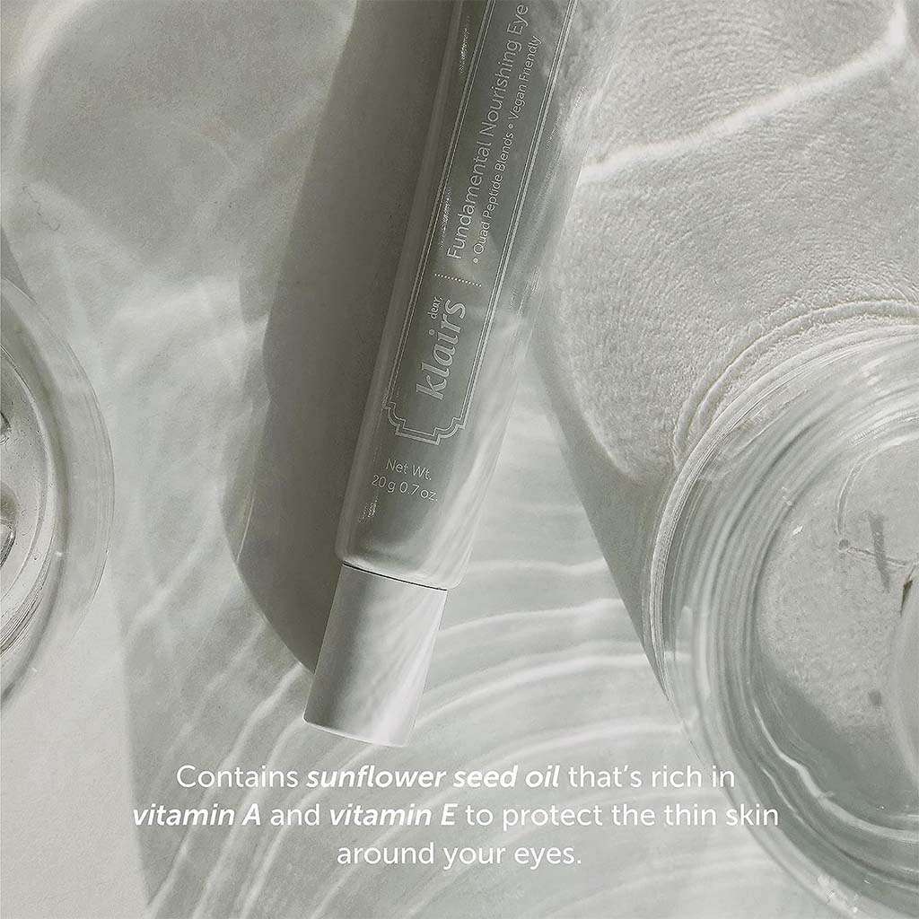 Dear Klairs Fundamental Nourishing Eye Butter is a moisturizer designed specifically for the delicate skin around the eyes. This nourishing moisturizer seems to have a combination of ingredients that offer various benefits to the under-eye area. The nourishing butter includes sunflower seed oil, is rich in vitamin A and vitamin E, which are known for their antioxidant properties. These vitamins can help protect the thin and sensitive skin around the eyes from environmental damage and oxidative stress. Vitamin A also plays a role in skin cell turnover, potentially aiding in the reduction of fine lines and wrinkles. Sunflower seed oil's antioxidant properties can contribute to preventing premature aging and wrinkles by neutralizing free radicals that can damage the skin's structure and elasticity. Dear Klairs Fundamental Nourishing Eye Butter contains several peptides, including acetyl hexapeptide-8, copper tripeptide-1, oligopeptide-29, and oligopeptide-32. Peptides are short chains of amino acids that can have various effects on the skin. They are often included in skincare products to help improve the appearance of fine lines and wrinkles by promoting collagen production and skin elasticity. The soft butter-like texture of the eye cream helps the product to be absorbed quickly into the skin. This can be beneficial for individuals who prefer products that don't leave a heavy or greasy feeling, especially those with oily skin types. Dear Klairs Fundamental Nourishing Eye Butter is said to be suitable for everyone, including those with concerns like milium (small, white bumps under the skin), as the formula doesn't appear to be excessively rich or oily. This makes it a versatile option for people who are looking for an eye cream that offers nourishment and hydration without being overly heavy. Overall, this eye butter moisturizer appears to offer a combination of antioxidant protection, skin nourishment, and peptide-based benefits to address concerns like fine lines and milia.