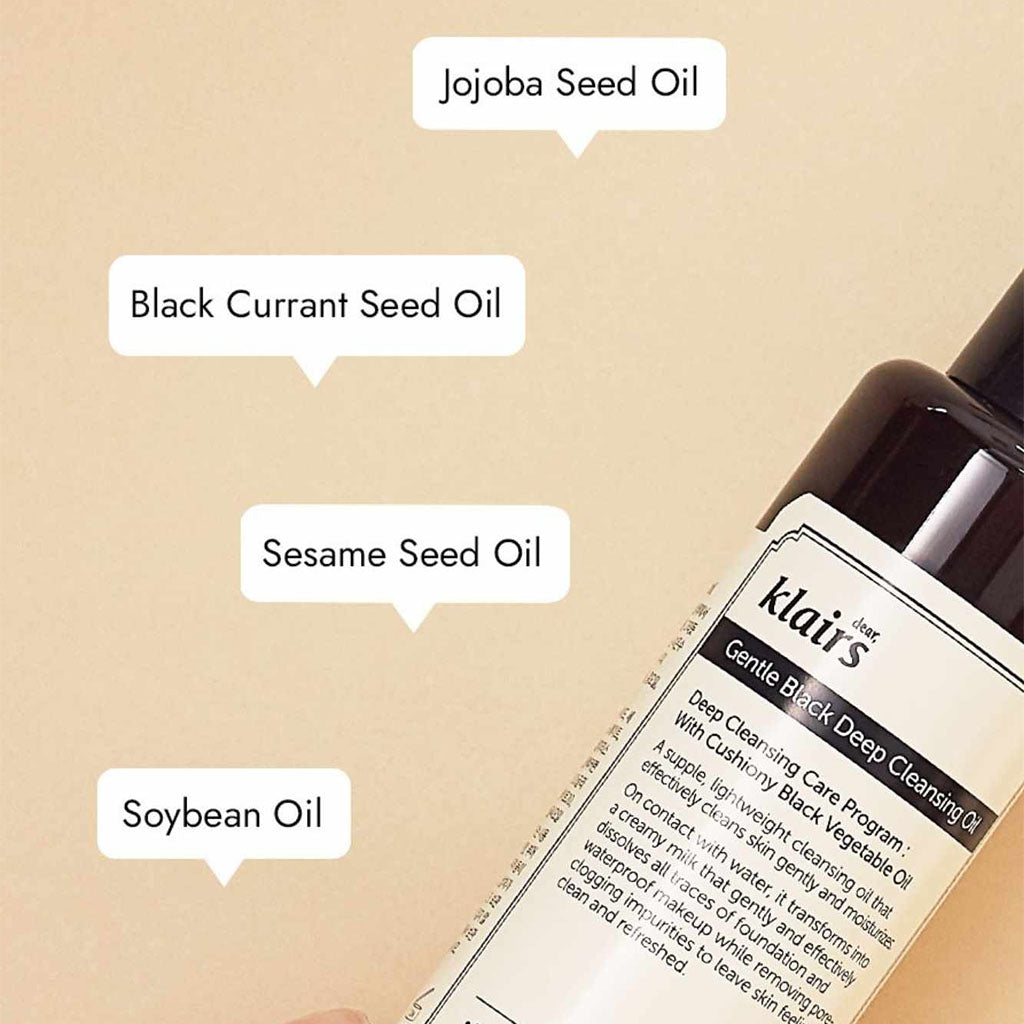 Dear Klairs Gentle Black Deep Facial Cleansing Oil is formulated with a variety of natural oils extracted from black grains, such as black beans, black sesame, and black currant seed oil. These oils are combined to offer gentle yet thorough cleansing, removing dirt and makeup while being suitable for sensitive skin. Black bean oil is mentioned to help regulate sebum production, which can be beneficial for individuals with oily or combination skin types. Dear Klairs Gentle Black Deep Facial Cleansing Oil’s formulation with natural oils aids in deep cleansing, potentially helping to unclog pores and remove impurities. The combination of oils might have a soothing effect on sensitive skin, which can be particularly useful for those who are prone to skin irritation. Black sesame oil is noted to provide antioxidant properties. Antioxidants can help protect the skin from environmental damage and support overall skin health. The inclusion of black currant seed oil, rich in minerals and vitamins, suggests that the cleansing oil could contribute to nourishing the skin, providing essential nutrients for its well-being. The completion of primary skin irritation tests and eye irritation tests indicates that the product has undergone safety testing to ensure it is suitable for sensitive skin and delicate eye areas. In summary, the Dear Klairs Gentle Black Deep Facial Cleansing Oil appears to be positioned as a cleansing option that offers both gentle and effective makeup and dirt removal while providing natural skincare benefits. The use of various natural oils and their specific properties contributes to the product's potential advantages for sebum control, pore cleansing, soothing effects, and skin nourishment.