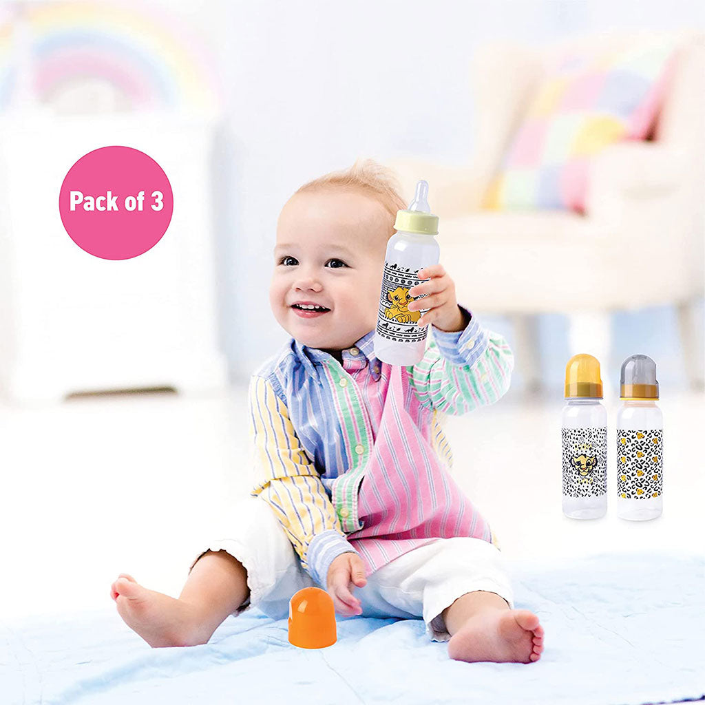 Disney The Lion King 260ml Feeding Bottle provides a complete line of feeding solutions for your baby's changing needs. The iconic classical shape of the feeding bottle helps the baby to have a good grip over the bottle and moms can comfortably hold them for a long time. The bottles are uniquely shaped are paired with venting technology. Expertly designed for easy assembly and leak-free feeding, the simple, one-piece integrated nipple and vent system means no extra parts to clean or lose. These soft silicone nipples rapidly vent, directing air bubbles into the bottle, not baby's tummy, which significantly reduces gas, colic, and fussiness. To help take the guesswork out of feeding your little one the Vented + Polypropylene Bottles feature molded measurement markers in both ounces and milliliters to provide an easy and accurate way to measure the volume of liquids without the risk of the measurements washing off. The unique shape, based on Disney's flagship design with a lightweight, helps to make these bottles simple to hold, simple to use, and simple to love. Rest assured, Disney bottles are 100% free of polycarbonates, PVC and phthalates, and are also made of food-grade material.