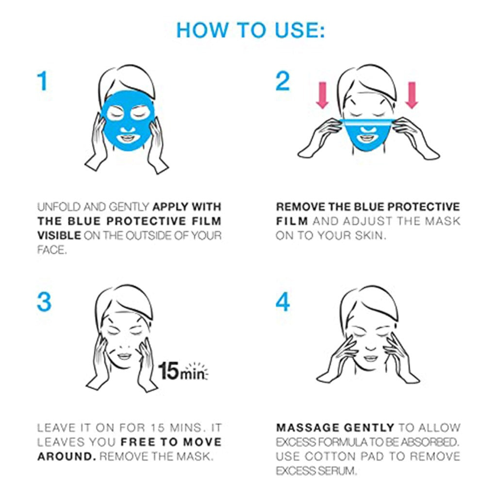 - Unfold mask. Carefully apply the white tissue to thoroughly cleansed skin. Make sure that the blue protective film is facing outwards.
