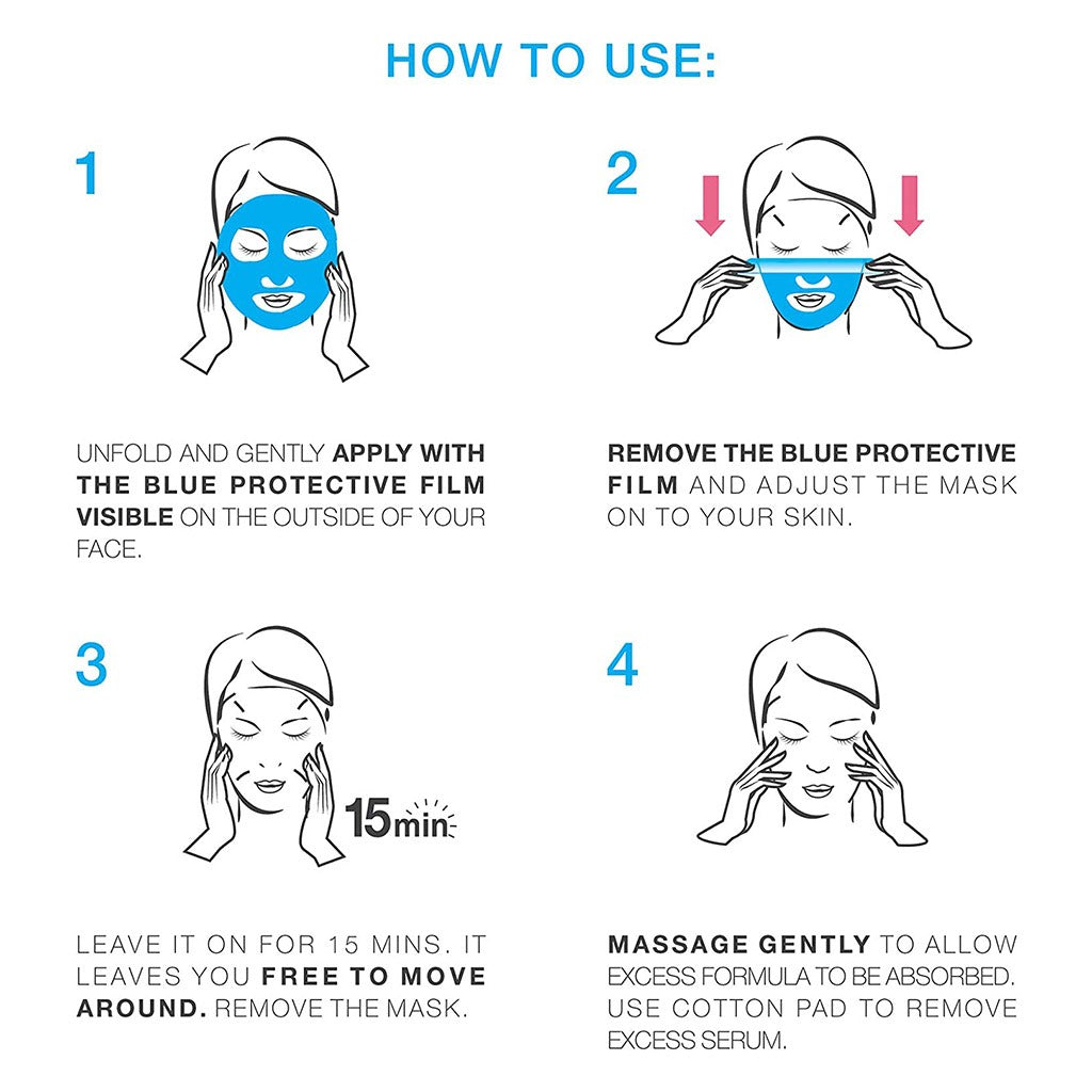 • To remove the mask, peel it off slowly from the edges. Gently massage any excess serum, or use a cotton pad to remove.