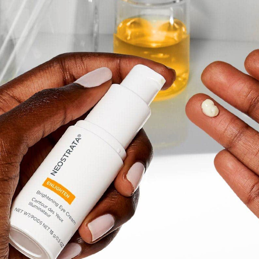 - Gently apply Neostrata Enlighten Brightening Eye Cream to the eye area twice daily