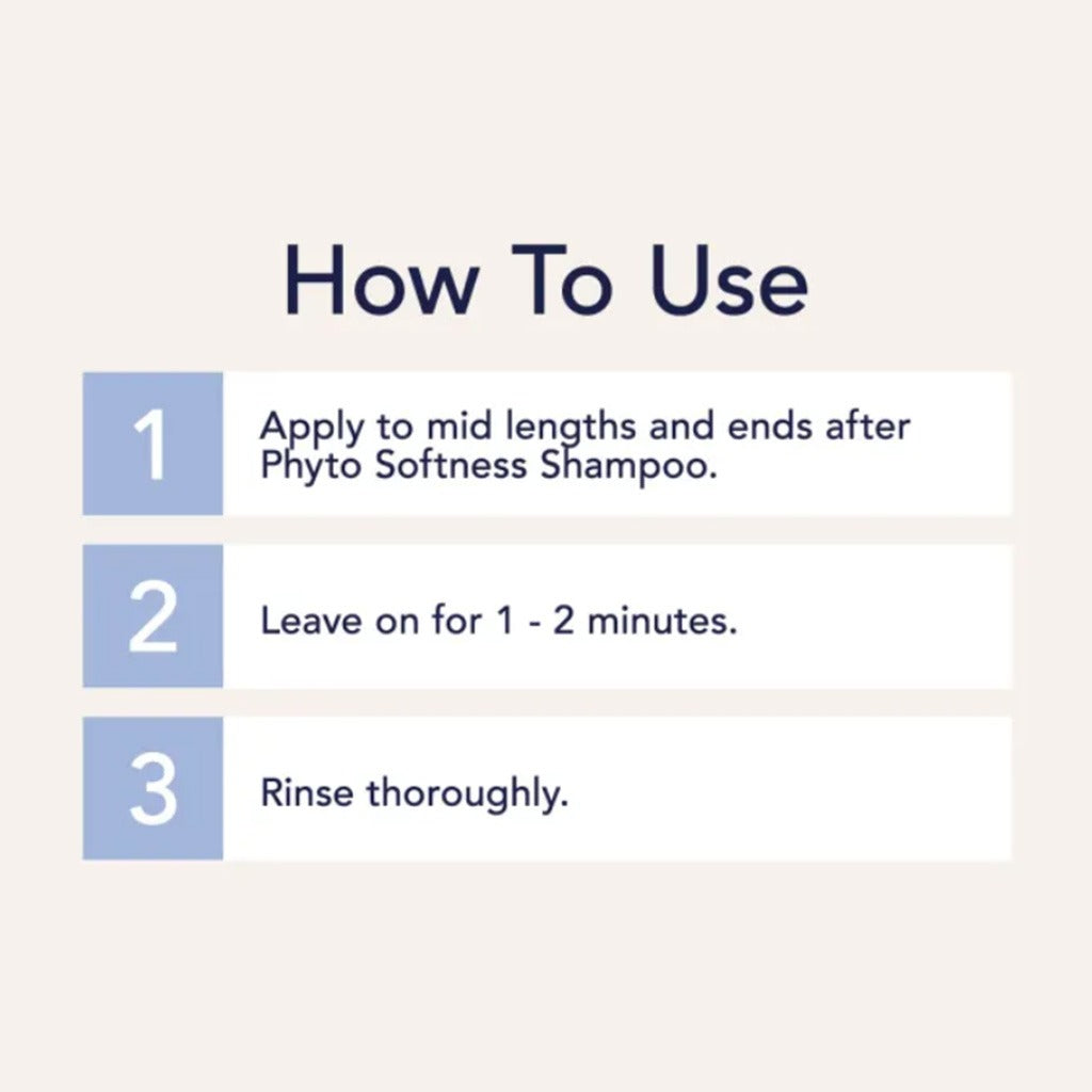- Before applying conditioner, wash your hair with a suitable shampoo to remove dirt, oil, and any styling products. After shampooing, rinse your hair thoroughly with water to ensure all the shampoo is removed. Gently squeeze out excess water from your hair. Your hair should be damp but not dripping wet. Take an appropriate amount of Phyto Softness Conditioner and apply it evenly to your hair. Focus on the mid-lengths and ends, as these areas tend to be drier. Avoid applying conditioner directly to the scalp unless the product instructions suggest otherwise. Use a wide-tooth comb or your fingers to distribute the conditioner evenly through your hair. After the recommended time, thoroughly rinse your hair with water. Make sure there is no residue left. Once your hair is rinsed, you can style your hair as usual. Some conditioners may also have styling benefits, so check the product description for any specific styling instructions.